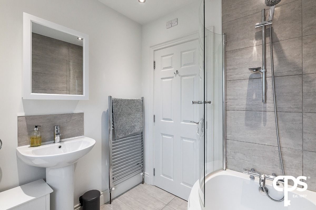 Contemporary family bathroom with three-piece white suite including shower over bath, wc and sink. This bathroom is finished to a high standard with stylish tiled floors, surround and chrome towel radiator.