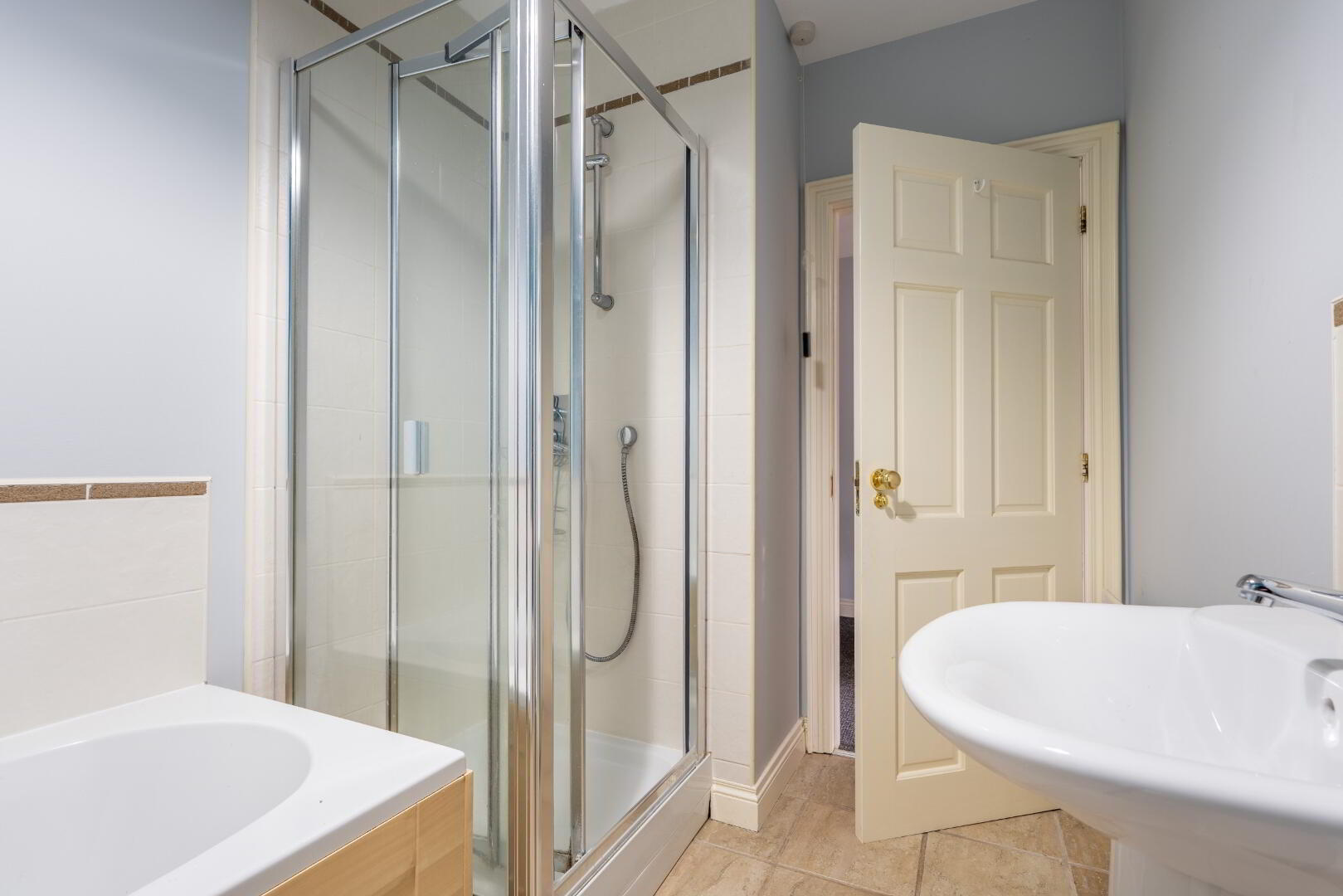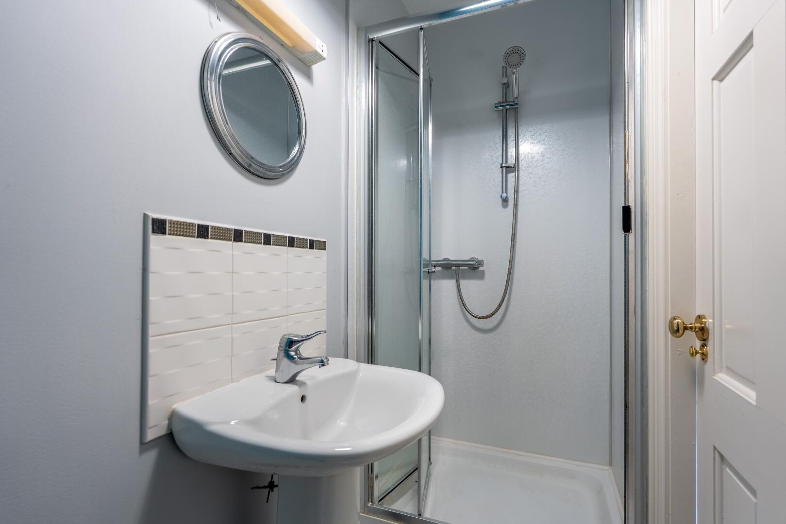 White suite comprising; low flush WC, pedestal wash hand basin, walk in shower cubicle with thermostatic valve fitting, tiled floor, single panel radiator, extractor fan.