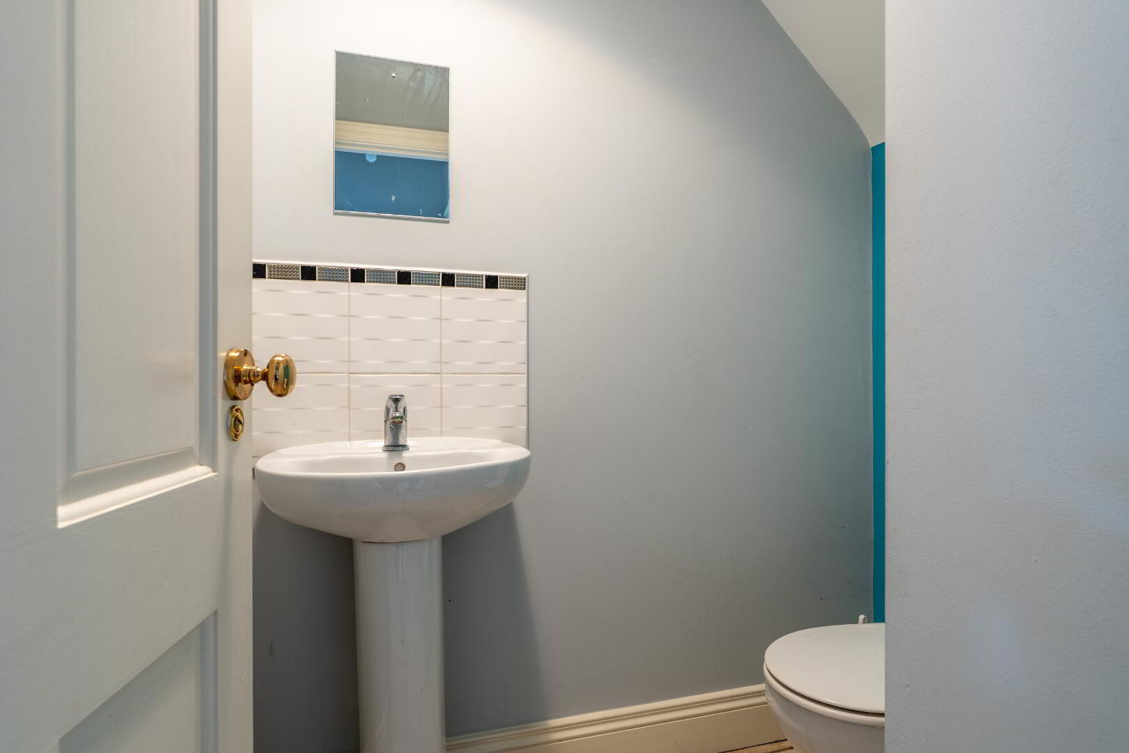 White suite comprising; low flush WC, pedestal wash hand basin, tiled floor, extractor fan.