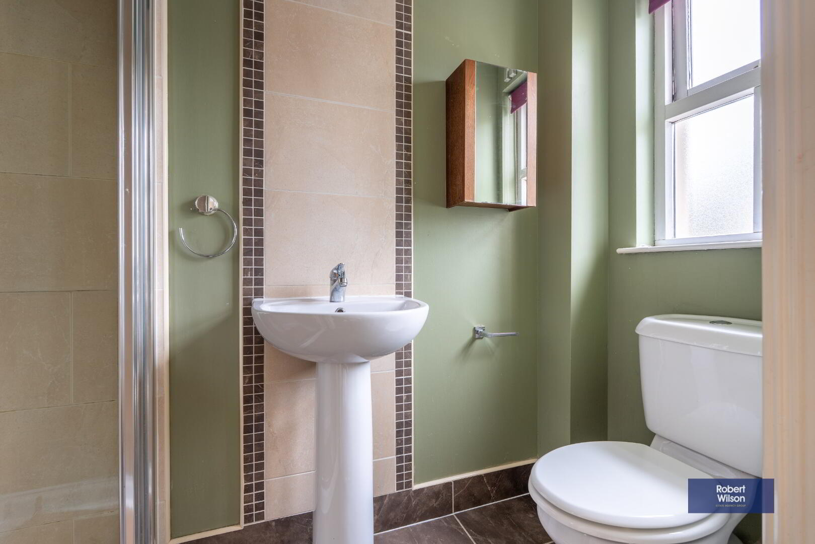 White suite comprising; low flush w.c, pedestal wash hand basin, walk in shower cubicle, part tiled walls, tiled floor, extractor fan.