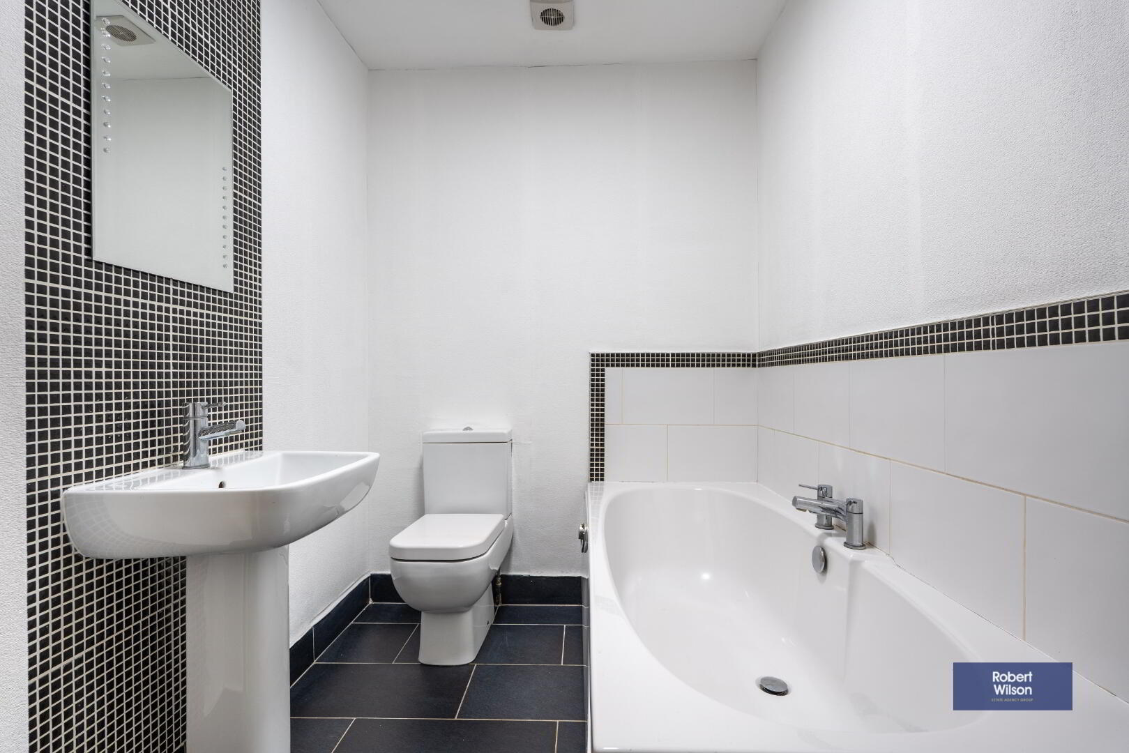 White suite comprising; low flush w.c., pedestal wash hand basin, panel bath tub, part tiled walls, tiled floor, extractor fan, single panel radiator.