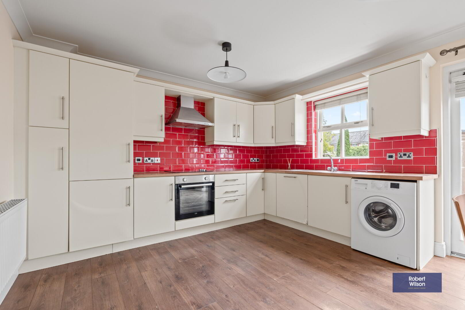 3.71m x 4.82m (12' 2" x 15' 10") Range of high and low level units, laminate worktop, stainless steel sink unit, integrated fridge freezer, integrated dishwasher, single oven, 4 ring ceramic hob with extractor over, space and plumbed for automatic washing machine, part tiled walls, French doors to rear garden and storage cupboard off.