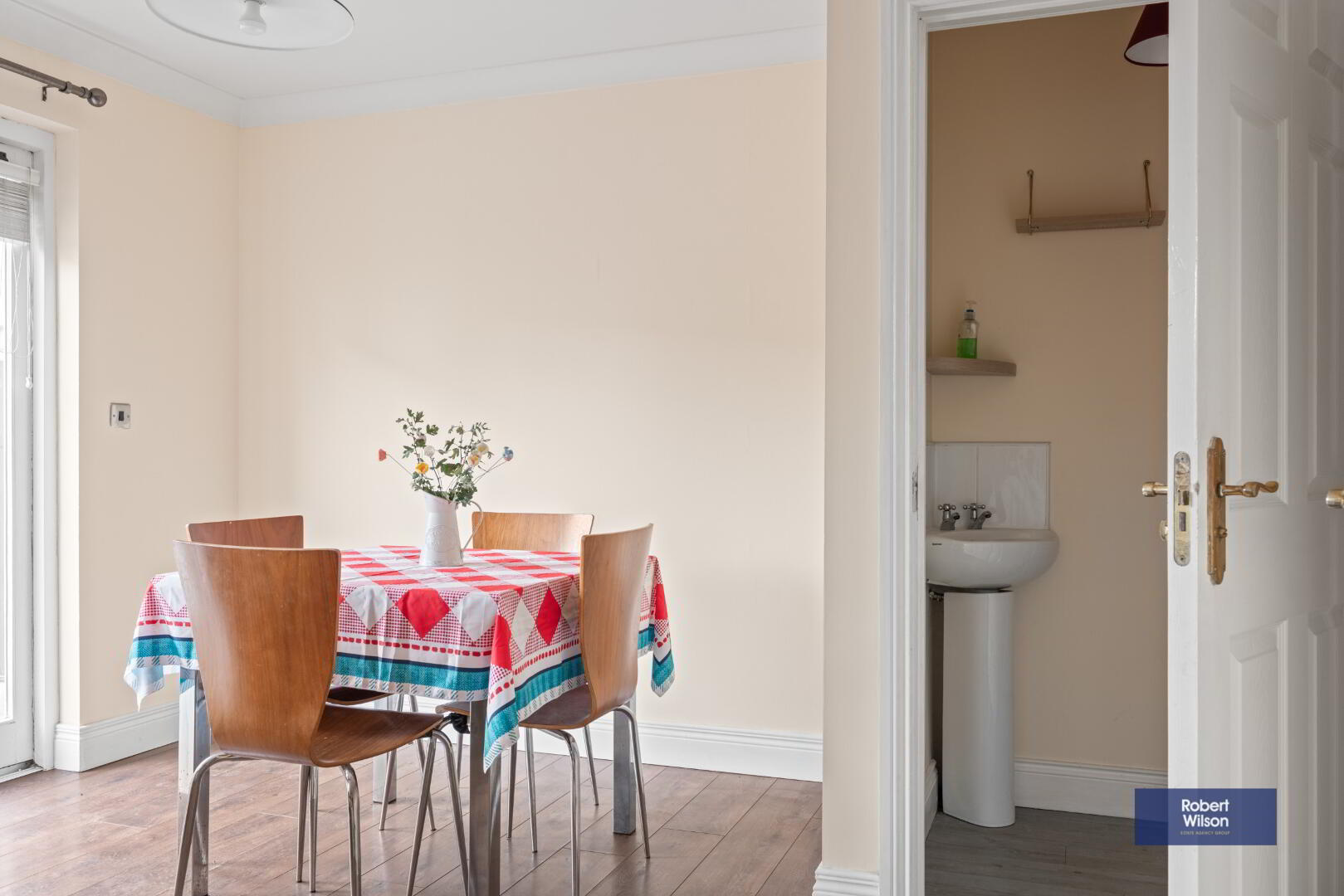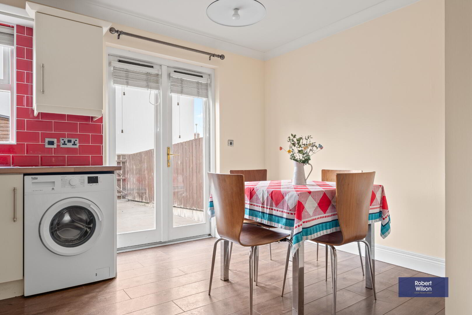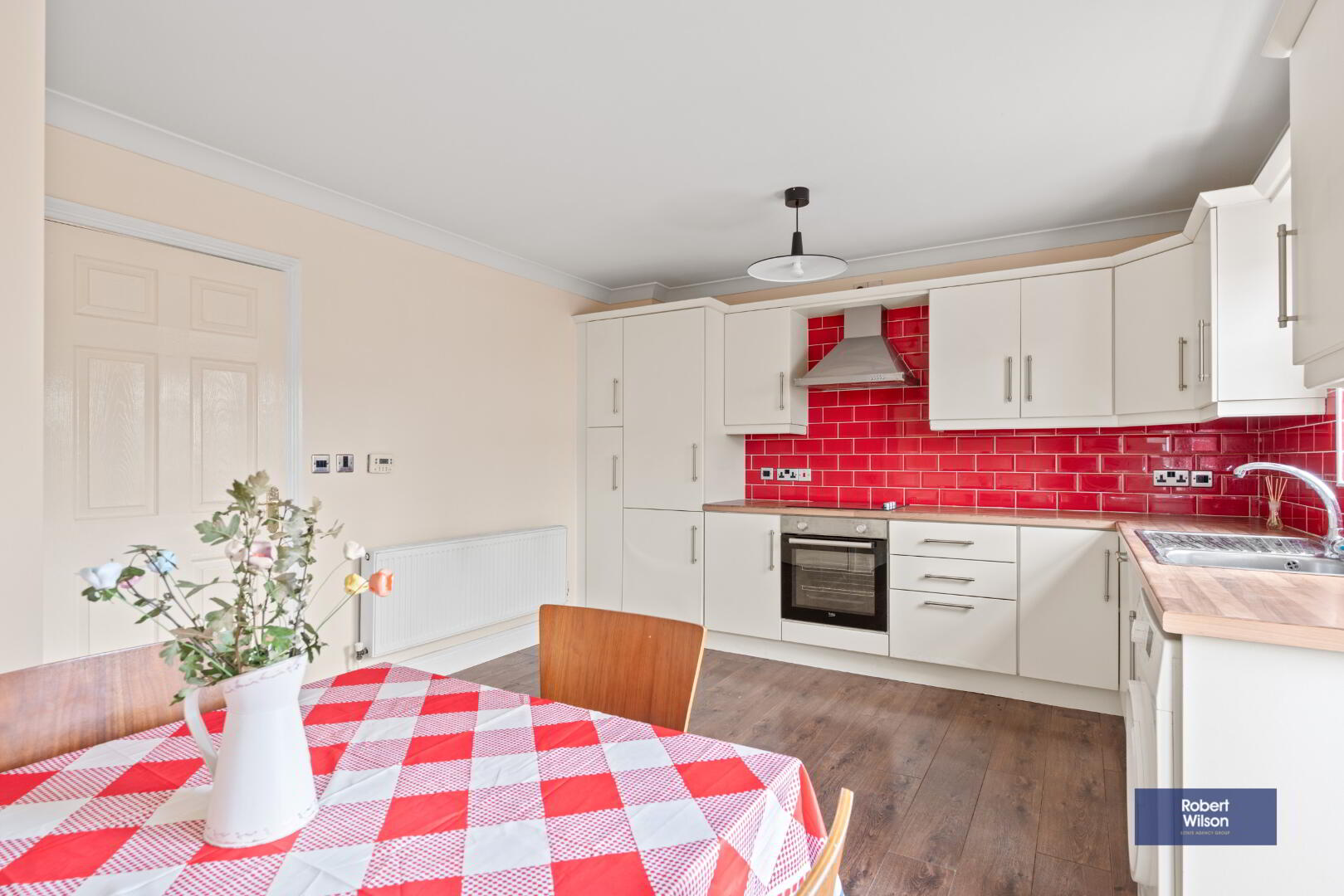 Inside, a welcoming entrance hall with tiled flooring leads to a bright lounge and a spacious kitchen/dining area — ideal for family living and entertaining. The kitchen features a full range of modern units, integrated appliances, and French doors opening to a private, fully enclosed rear garden. A convenient ground floor W.C. completes this level.