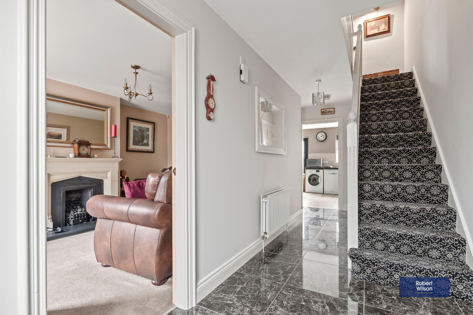 The property welcomes you with a bright entrance hall featuring tiled flooring and under-stair storage, leading to a well-proportioned lounge with a feature fireplace and a cosy, homely feel.