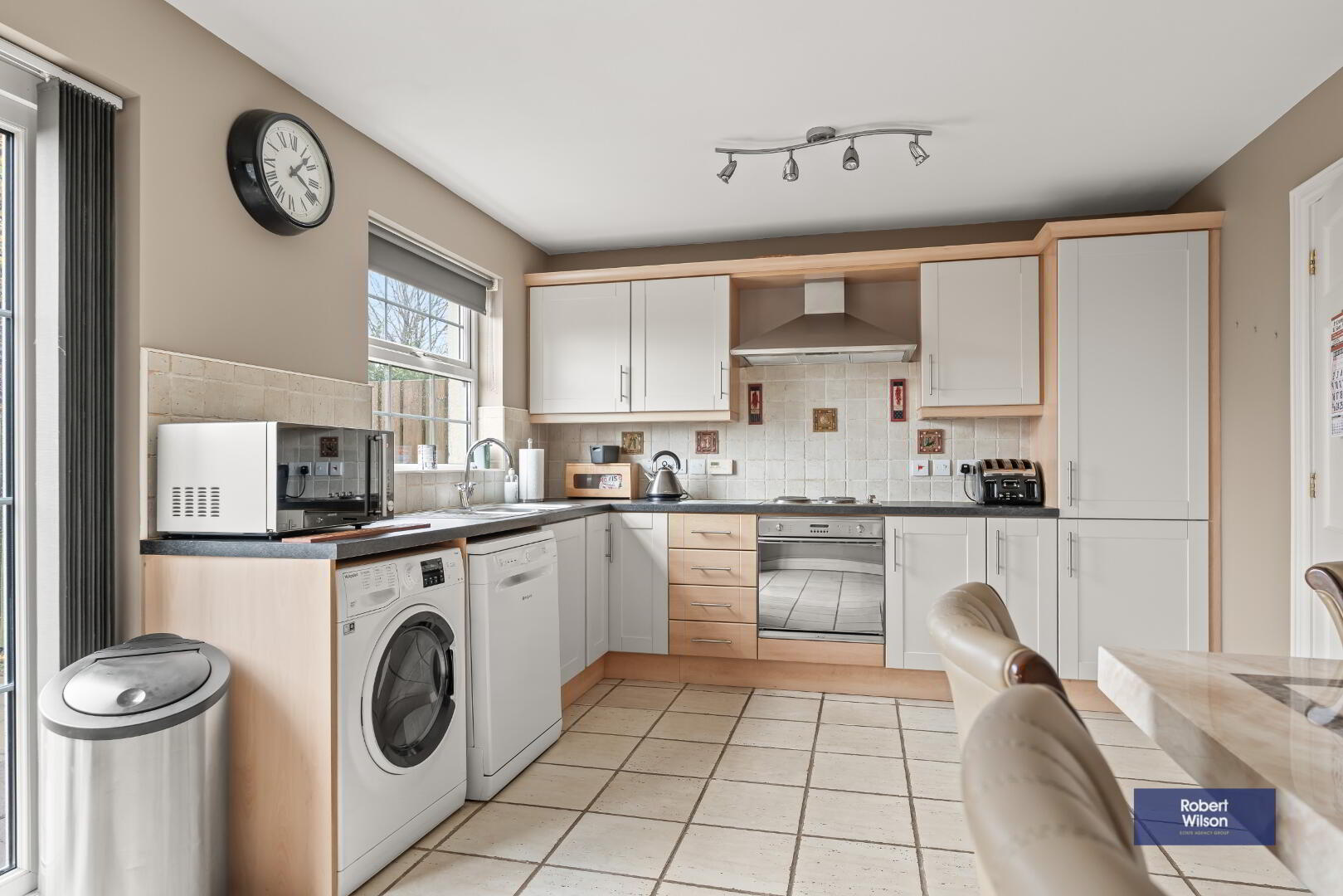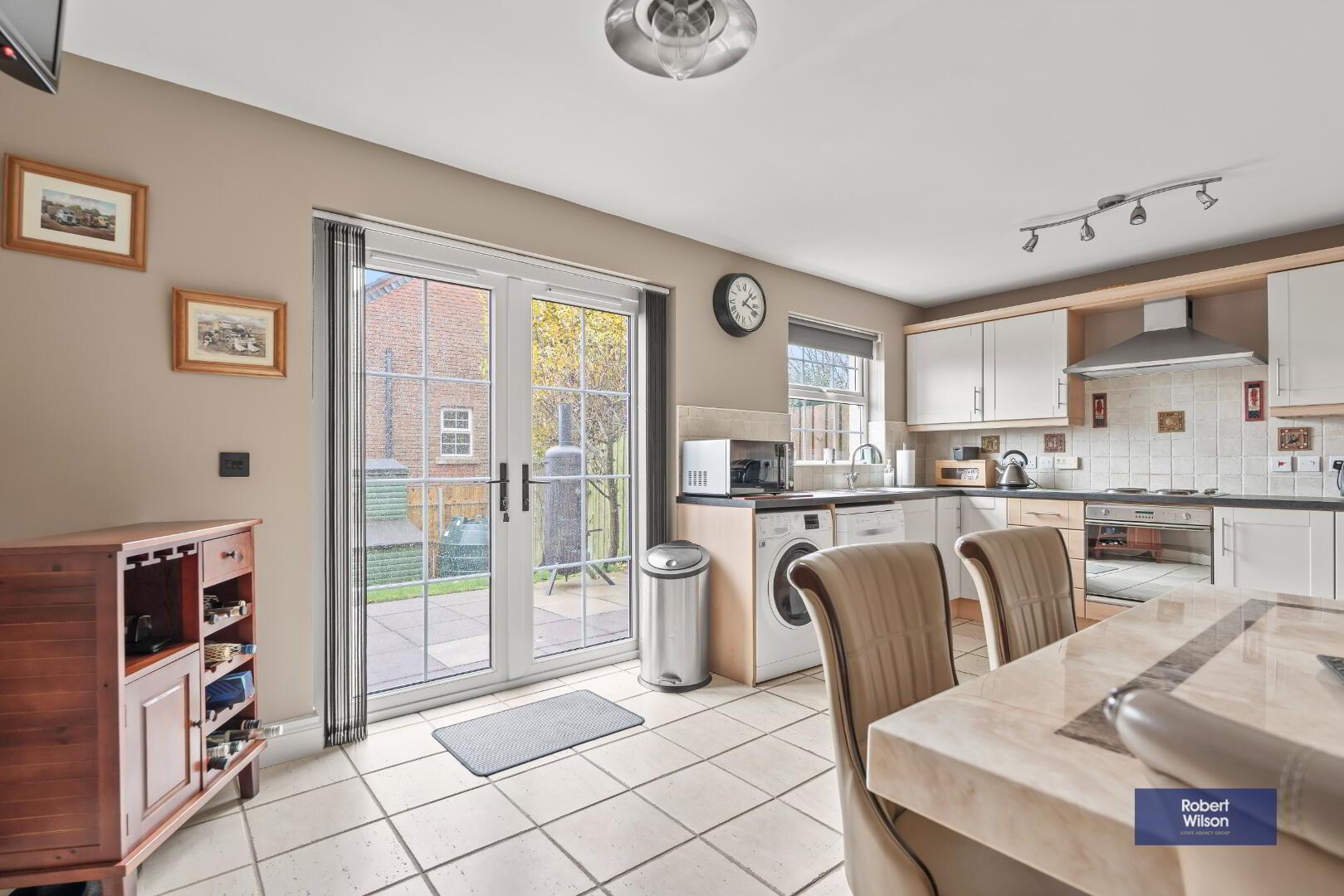 Range of high and low level units, laminate worktop, stainless steel sink unit, single oven with 4 ring hob and extractor fan over, integrated fridge freezer, dishwasher and washing machine. Walk in storage cupboard with light, French doors to patio area.