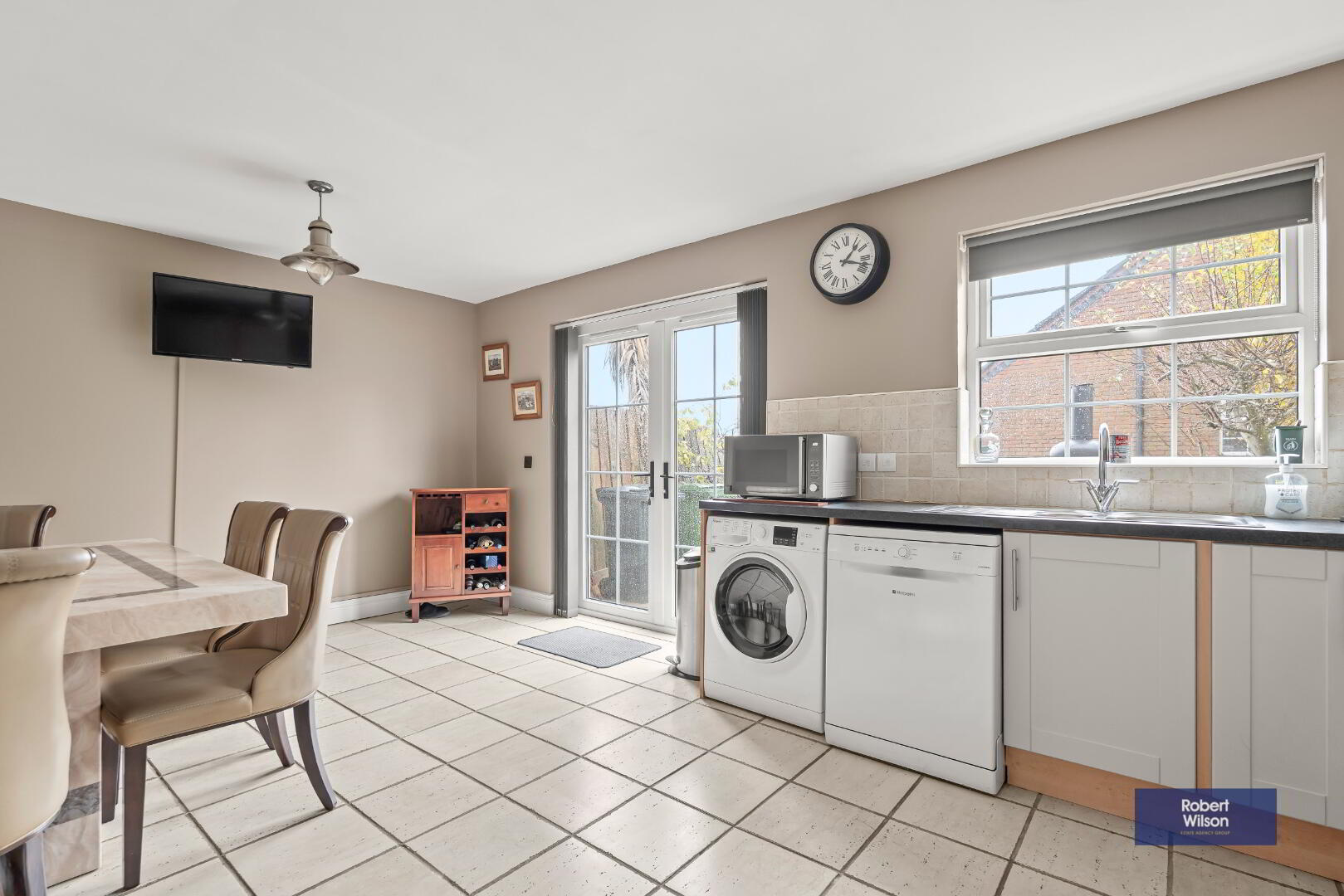 The kitchen/dining area is both stylish and practical, fitted with a range of high and low level units, integrated appliances, and French doors opening to a private patio — perfect for outdoor dining or relaxation. A cloakroom completes the ground floor accommodation.