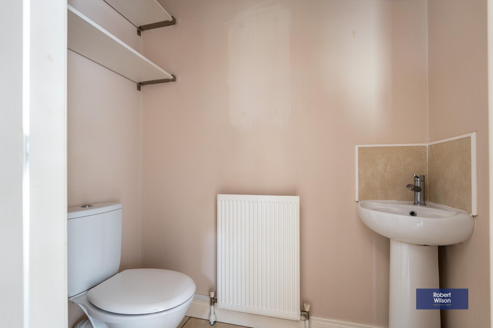 5' 10" x 3' 3" (1.78m x 0.98m) White suite comprising, pedestal wash hand basin, low flush W.C., extractor fan, 1 x single panel radiator, tiled flooring.
