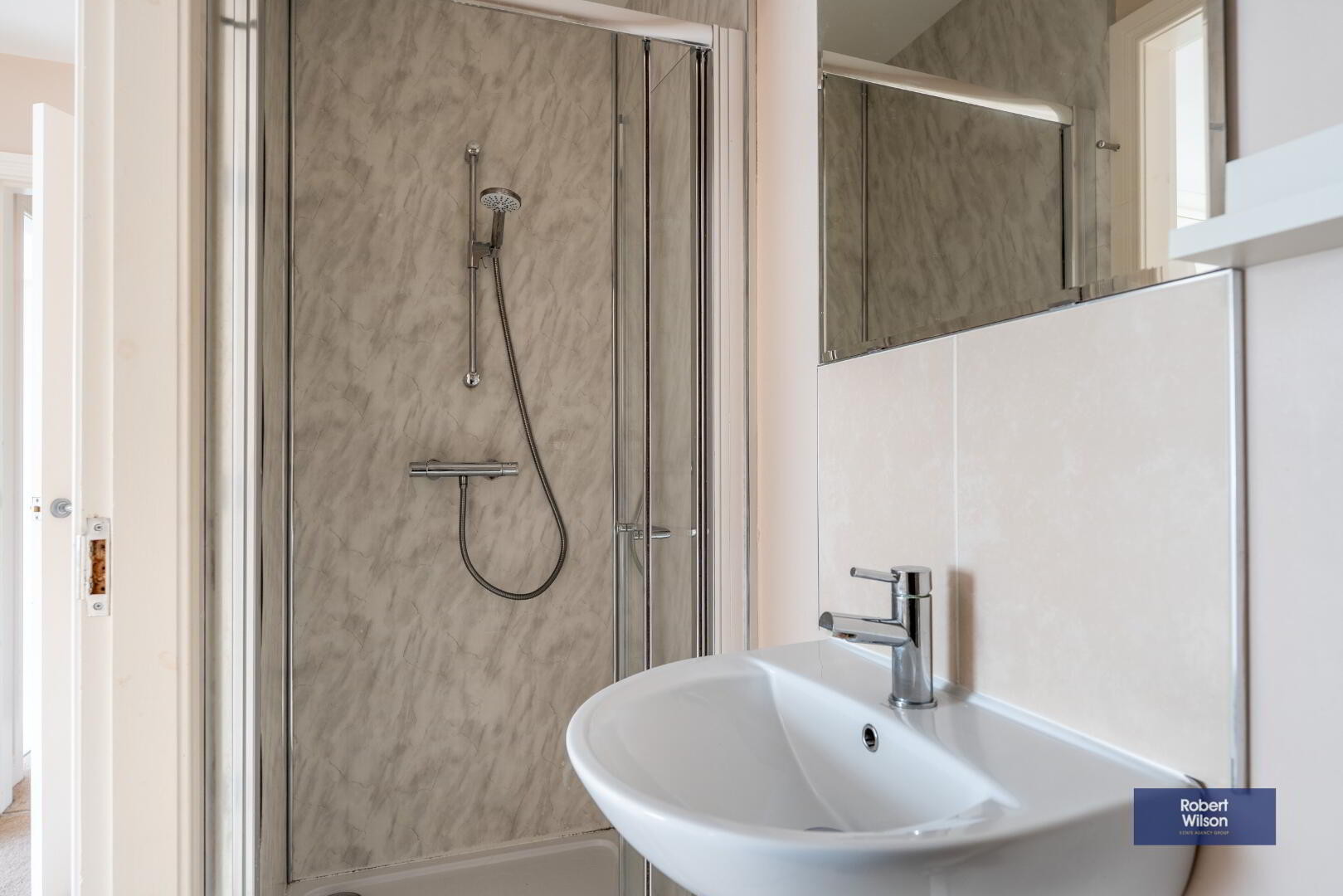 White suite comprising, wall mounted pedestal wash hand basin, low flush W.C, walk in shower cubicle with mixer taps, part tiled walls, tiled flooring, low voltage recessed lighting, 1 x single panel radiator.
