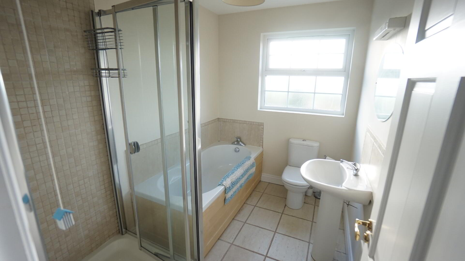 White suite comprising; low flush wc, pedestal wash hand basin, panel bathtub, walk in shower cubicle with thermostatic valve, part tiled walls, tiled floor, extractor fan, radiator.