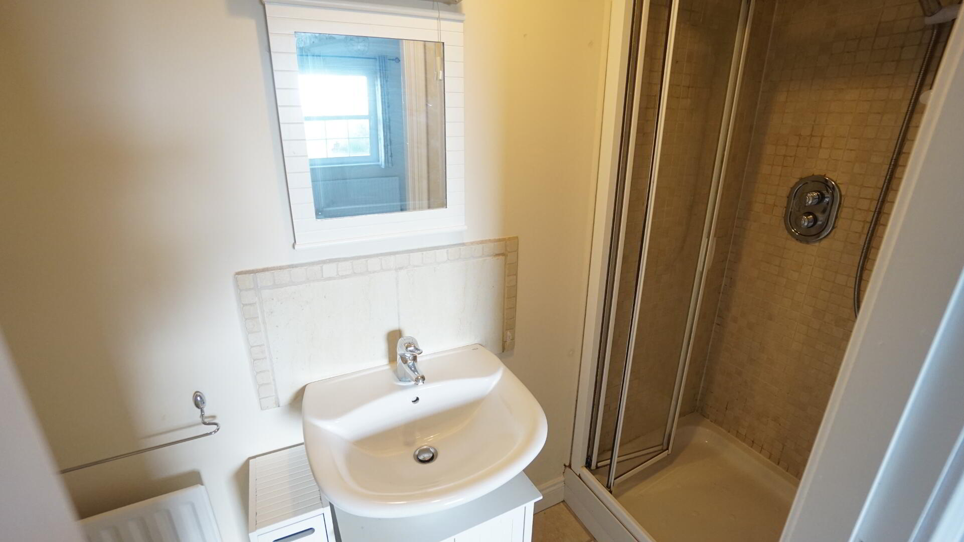 White suite comprising; low flush wc, pedestal wash hand basin, walk in shower cubicle with thermostatic valve, part tiled walls, tiled floor, extractor fan, single panel radiator.