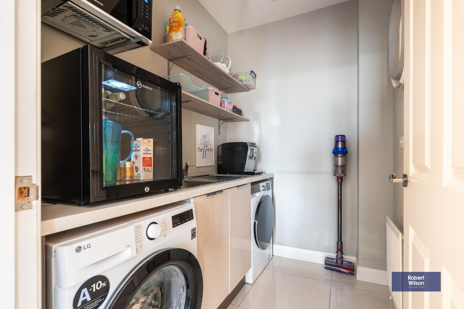 2.09m x 1.63m (6' 10" x 5' 4") Range of units, plumbed and space for automatic washing machine and tumble dryer, tiled floor.