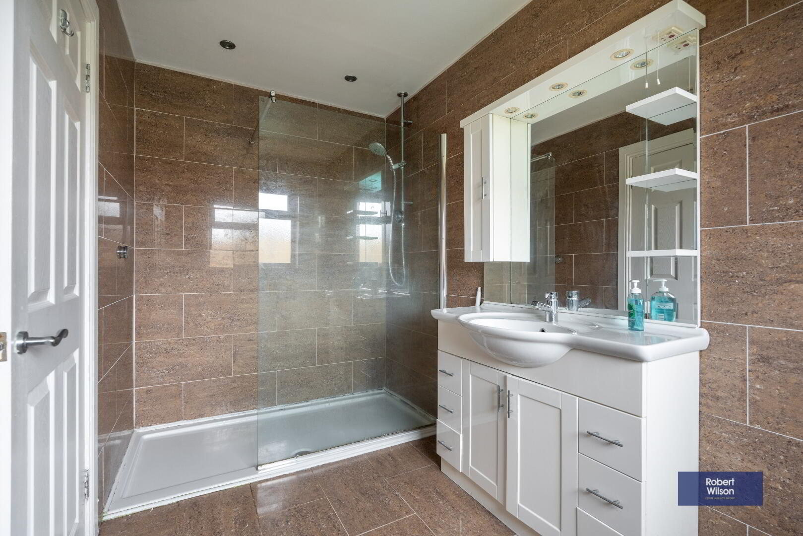 White suite comprising; Vanity incorporated wash hand basin, low flush w.c., large walk in shower with Aqualisa shower, recessed lighting, fully tiled walls, tiled floor.