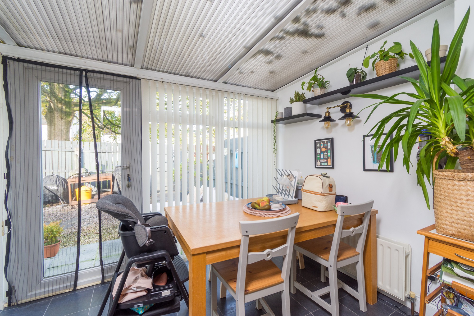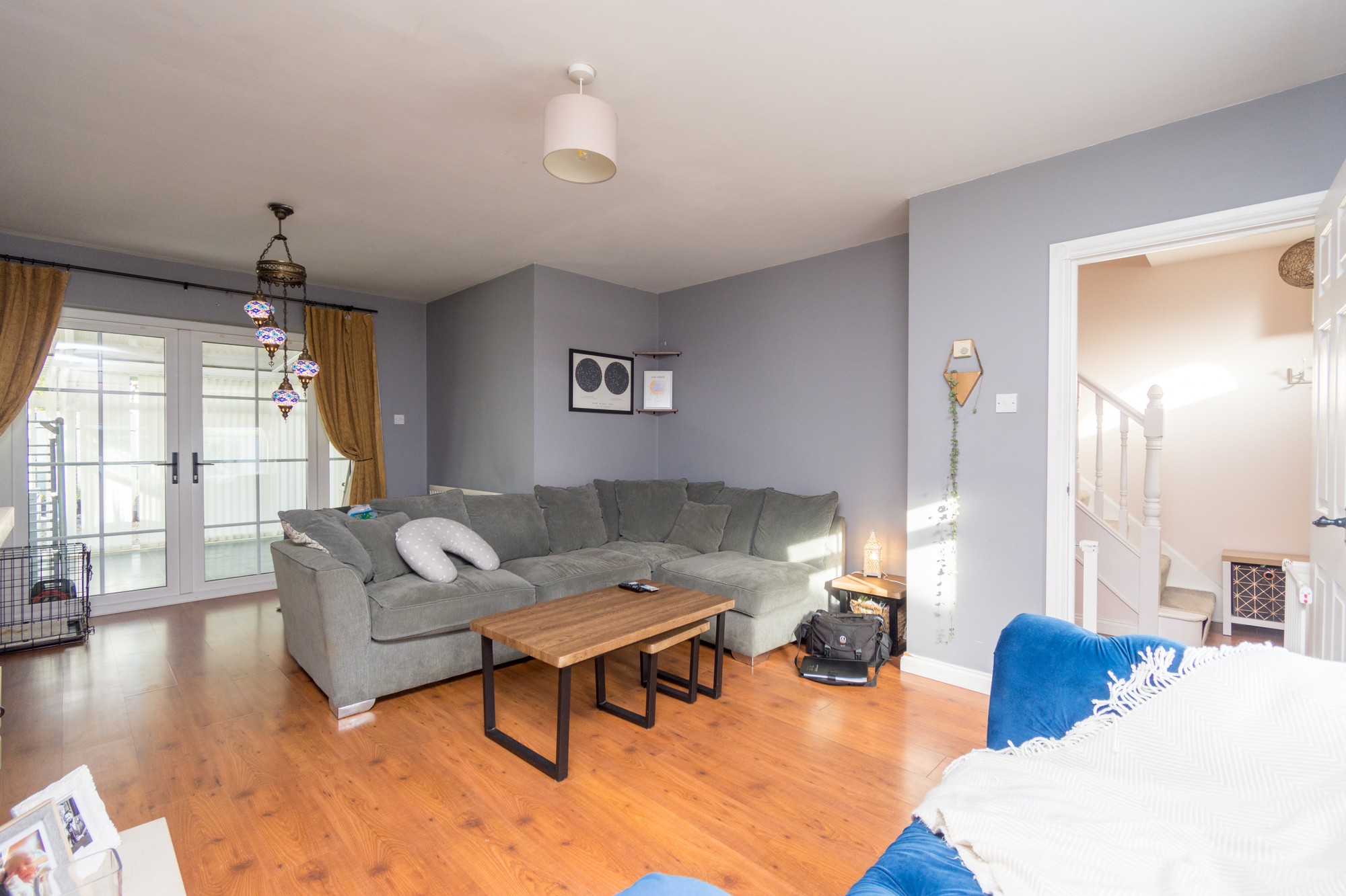 Feature fireplace with inset gas fire, wooden laminate flooring, uPVC double glazed patio doors to conservatory.