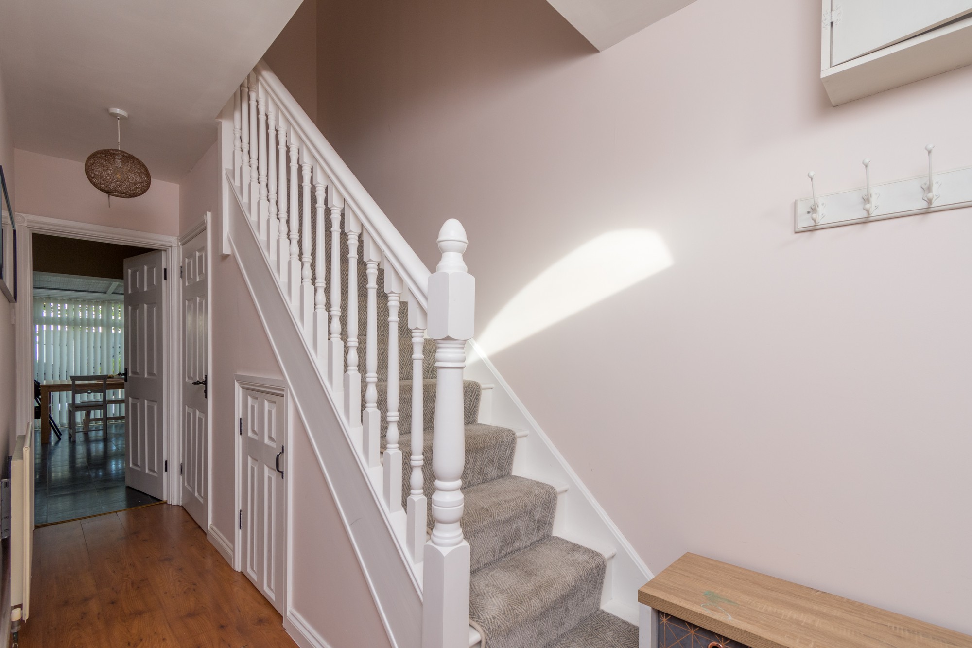 PVC panelled entrance door, double glazed fanlight window, spindled staircase to first floor, understairs storage cupboard, wood laminate flooring.