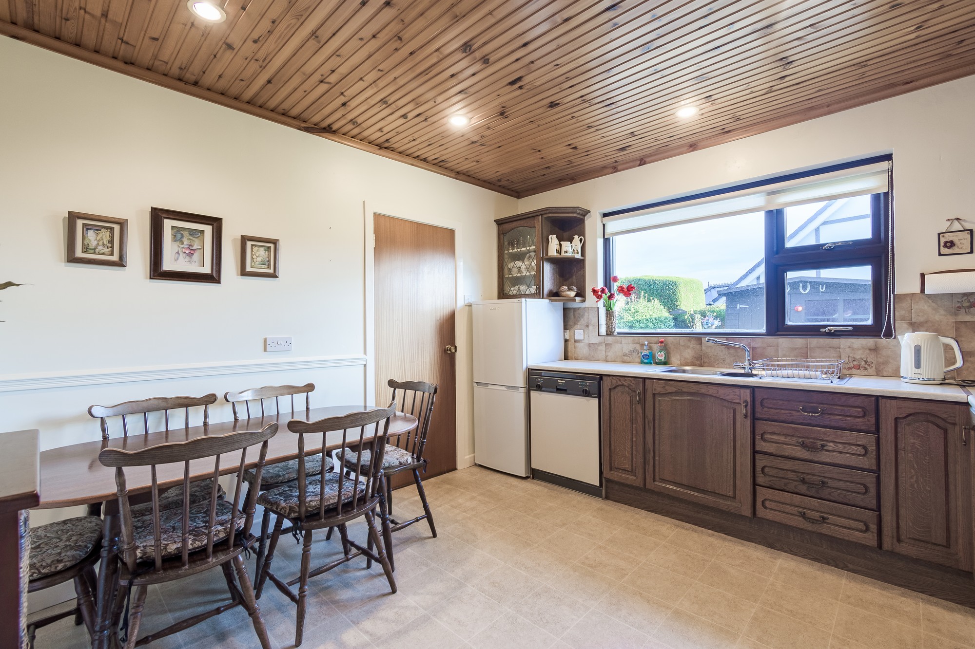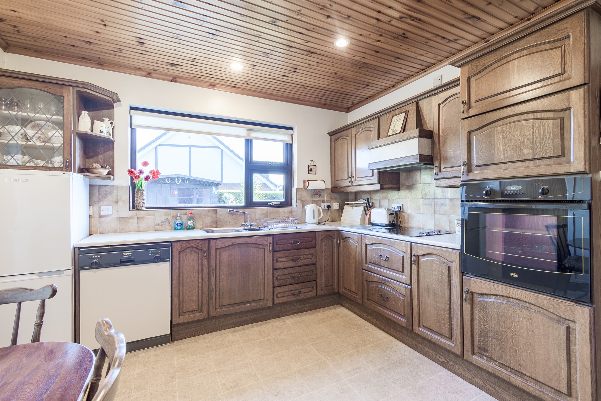 Dark oak traditional style fitted kitchen with good range of high and low level units. 11/2 bowl sink unit with mixer taps. Extractor hood. 4 Ring hob. Built-in oven. Plumbed for dishwasher. Space for fridge. Pine panelled ceiling with recessed lighting. Part tiled walls.