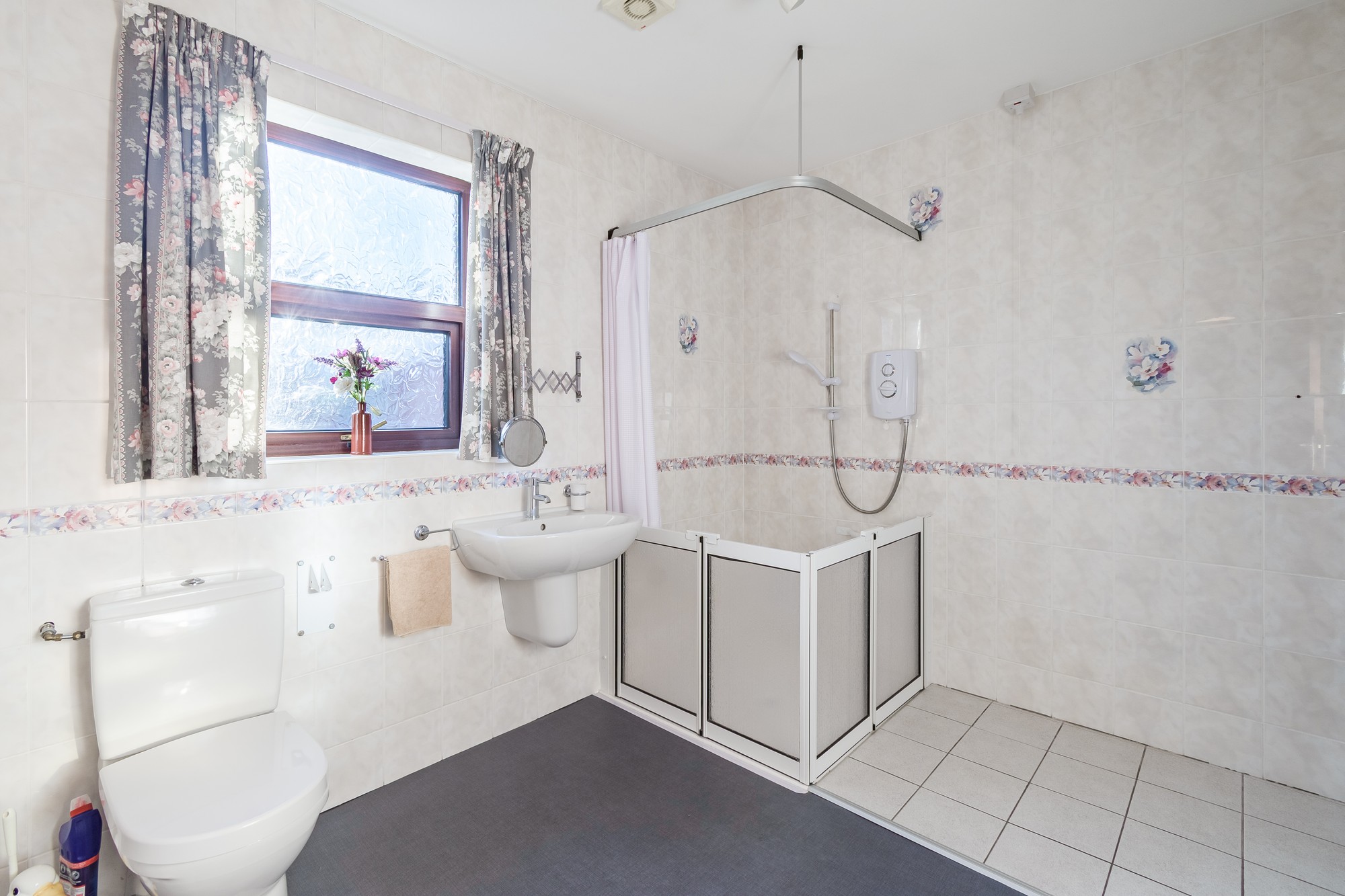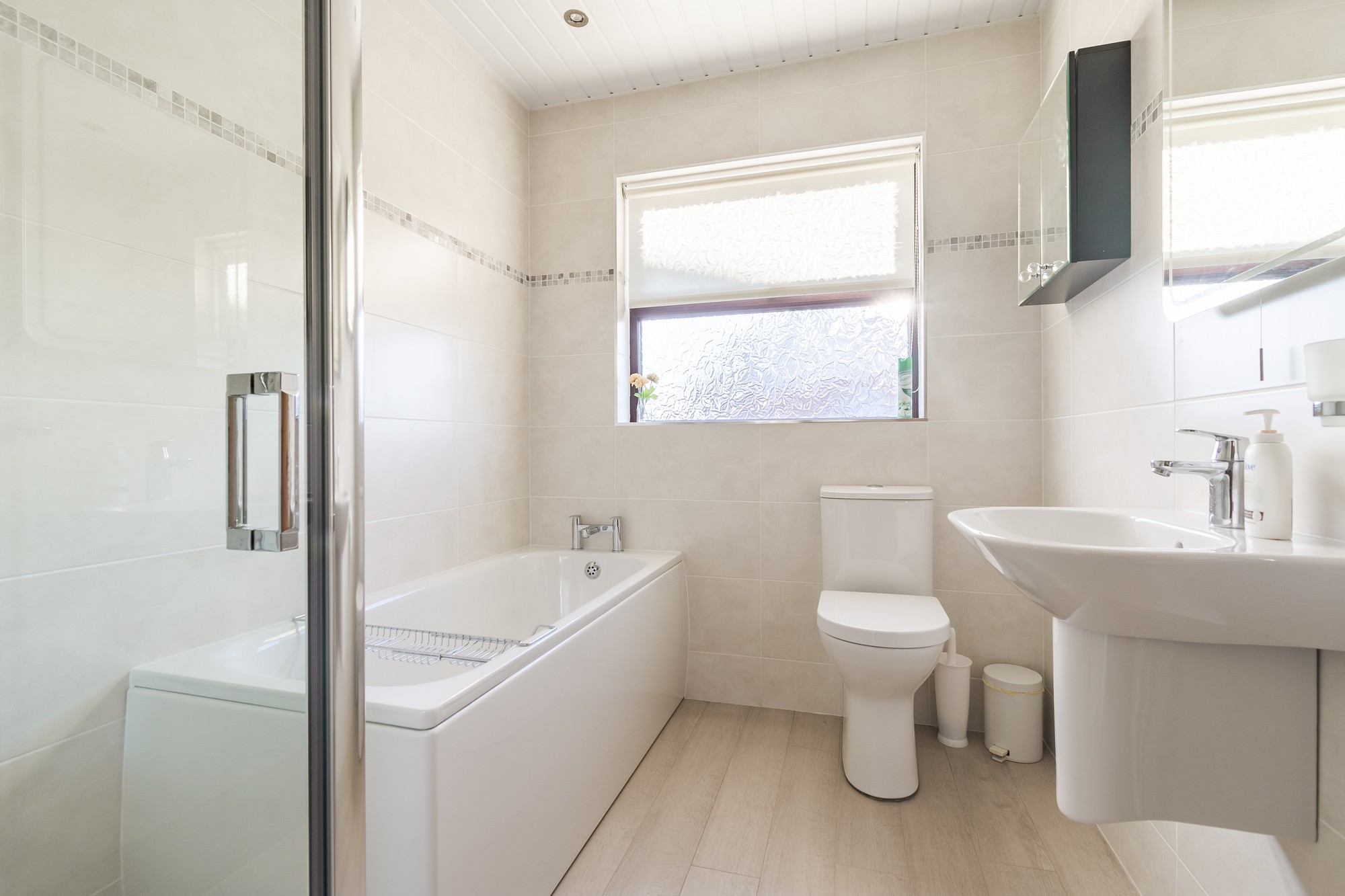 Modern white coloured sanitaryware comprising; low flush wc, semi-pedestal wash hand basin, panelled bath with mixer taps, and panelled shower cubicle. Fully tiled walls. Wooden laminate flooring. PVC panelled ceiling with low voltage downlights. Chrome heated towel rail
