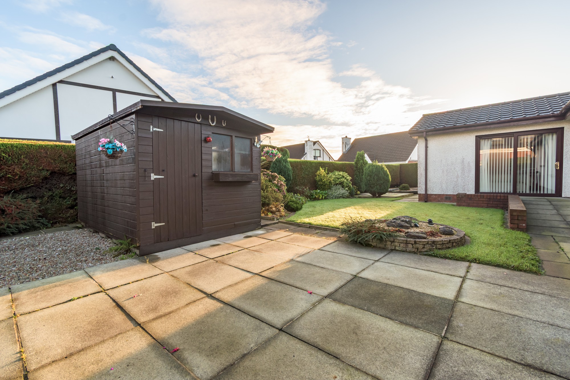 Enclosed private rear garden in lawn with mature well-stocked flowerbeds in plants and shrubs. Paved patio area. Wooden garden shed. Ramp leading to patio doors at Bedroom 1