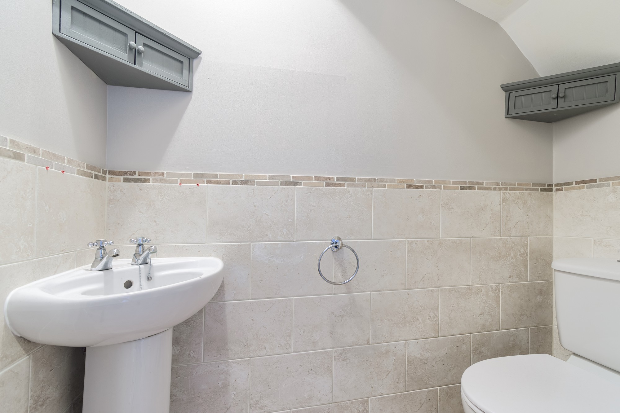 Low Flush WC. Pedestal Wash Hand Basin. Half Tiled Walls. Tiled Floor.