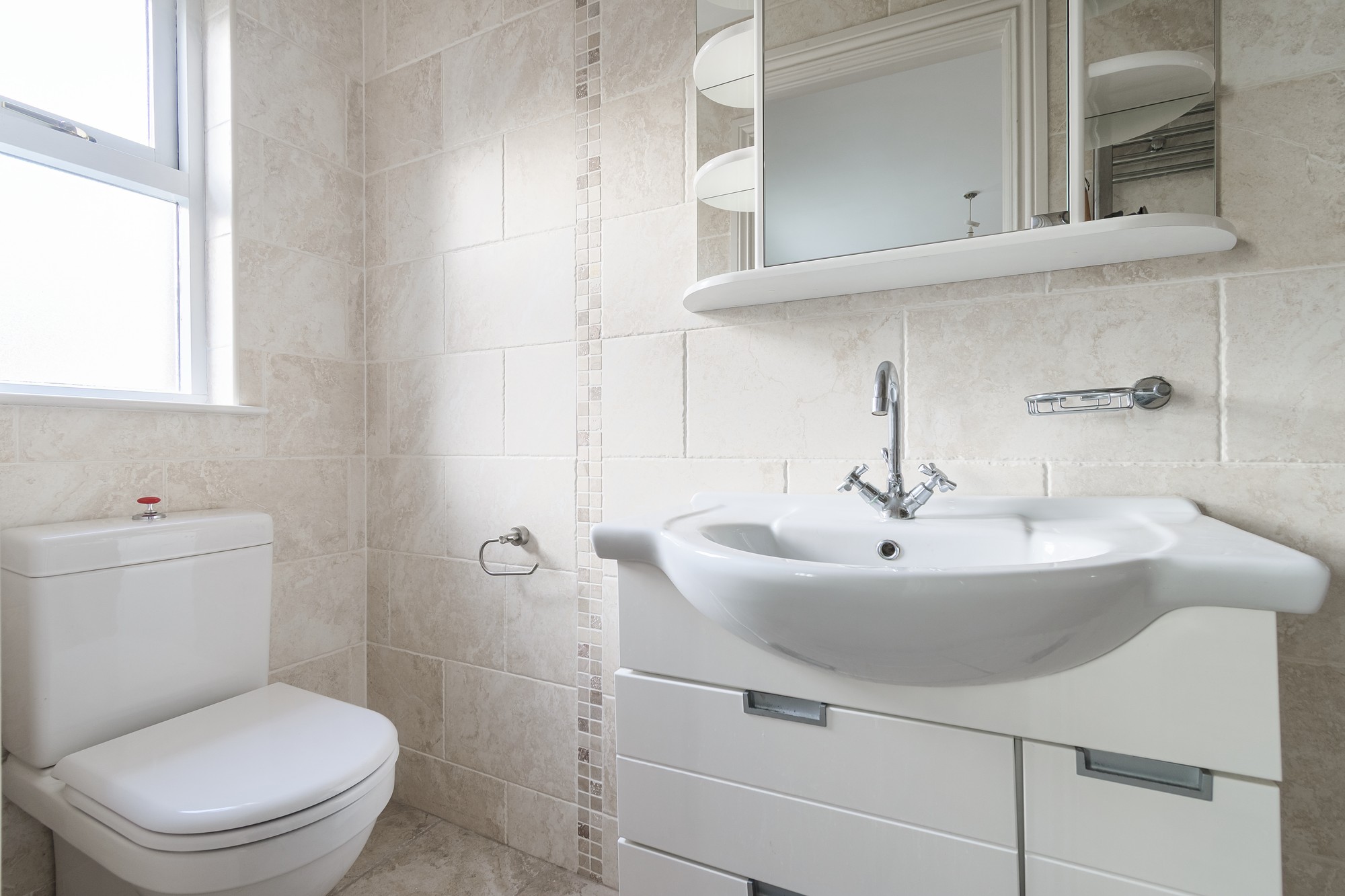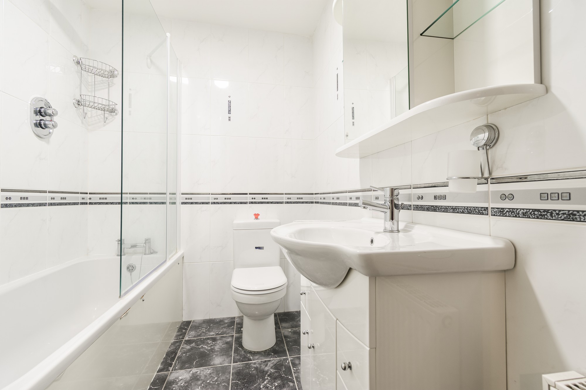Modern White coloured Suite comprising Panel Bath with Mixer Tap, Glass Shower Screen and Power Shower over Bath. Fully Tiled Walls. Low Flush WC. Tiled Floor. Access to Roof Space.