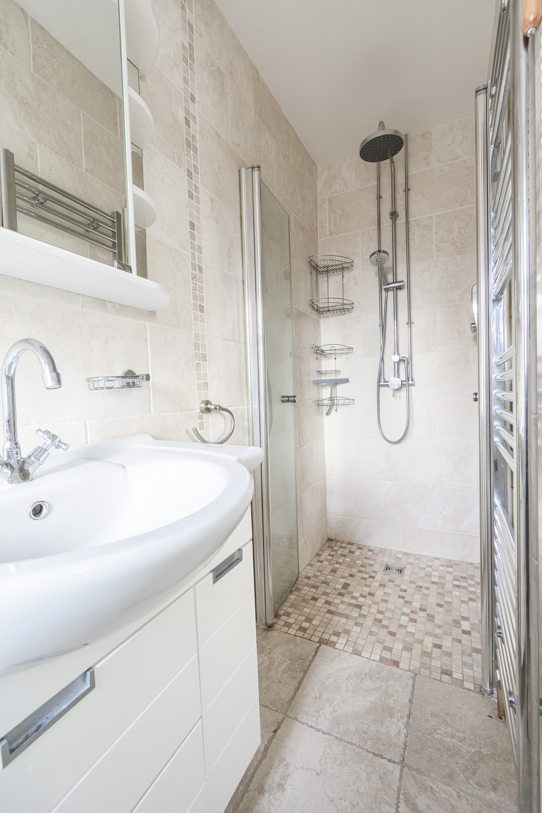 Modern White coloured Suite comprising Glass Shower Enclosure with Power Shower, Vanity Unit with inset Wash Hand Basin and Mixer Tap. Glass Mirrored Cabinet. Low Flush WC. Fully Tiled Walls and Floor.
