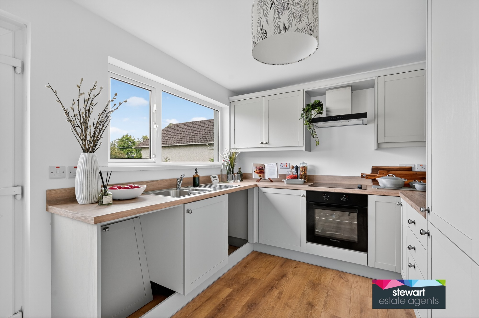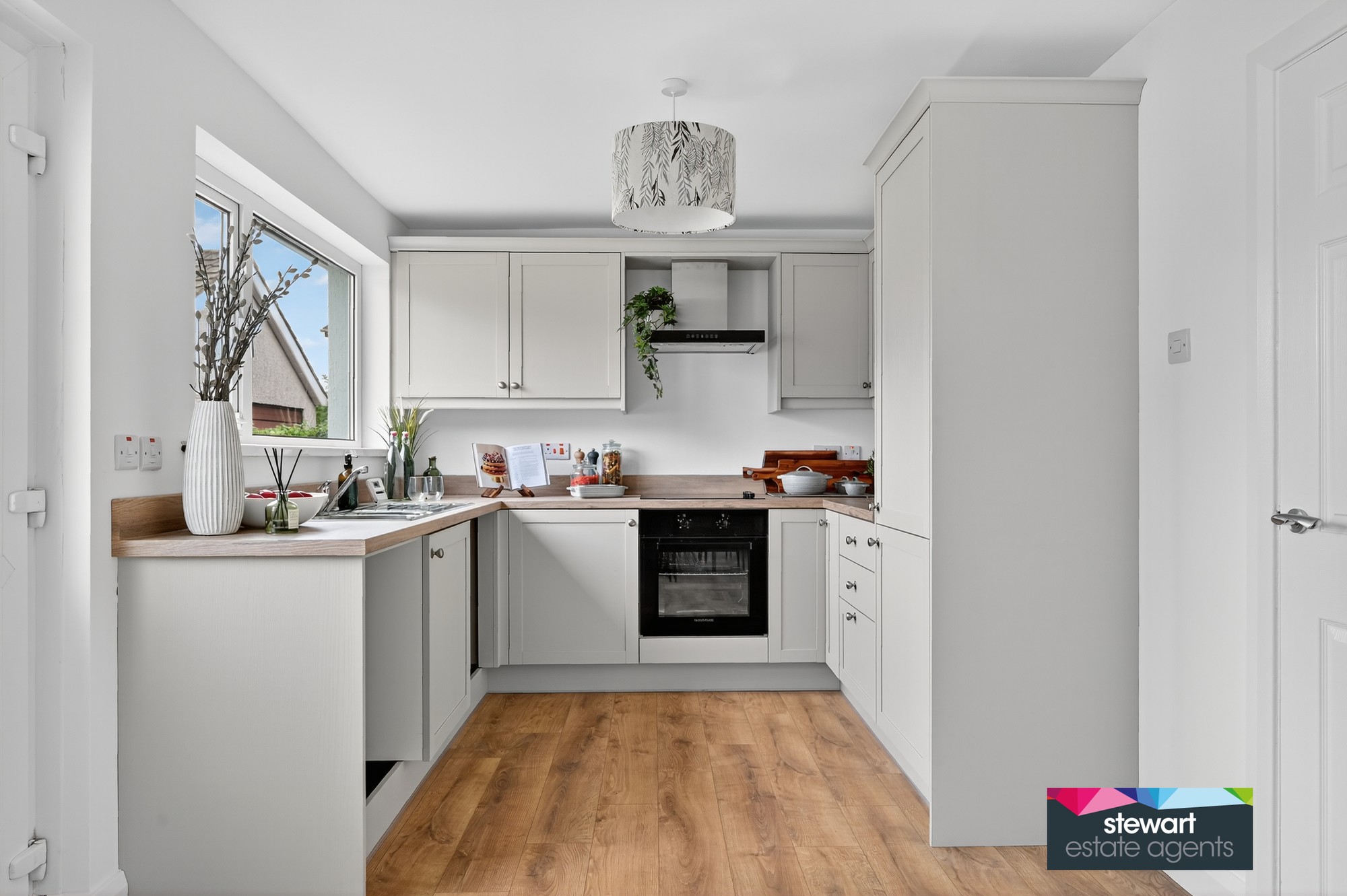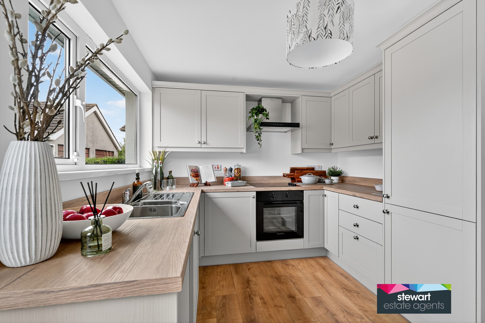 Open plan kitchen with dining room, having a contemporary style cabinetry with ample high and low level units. Space for integrated appliances. Built in oven and inset hob with extractor fan above