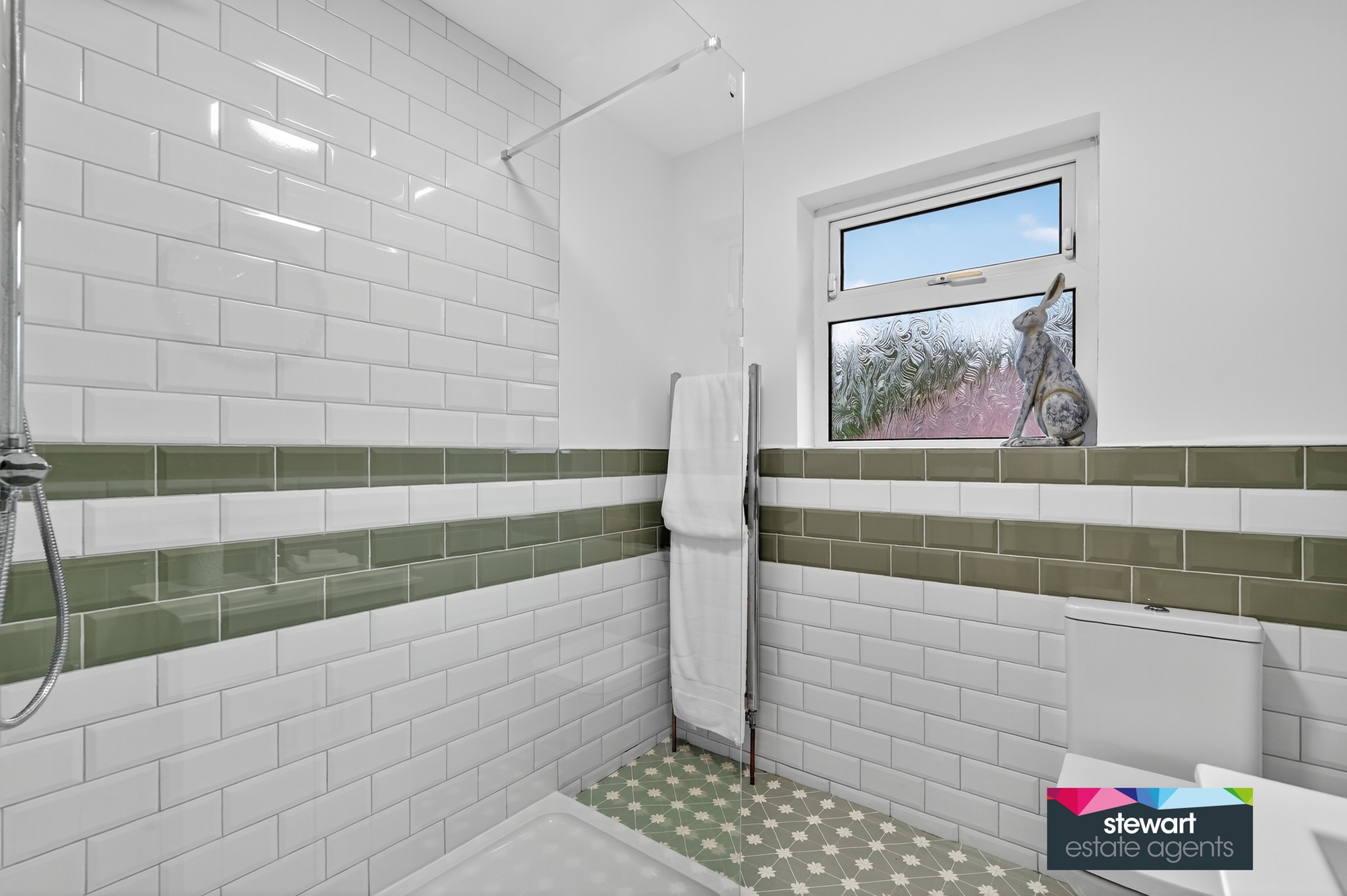Newly renovated shower room with a walk in shower area with shower screen, WC and vanity wash hand basin. Stylish tiling. Fitted towel rail
