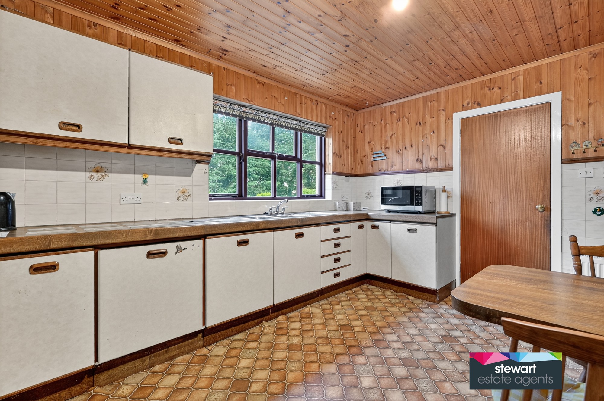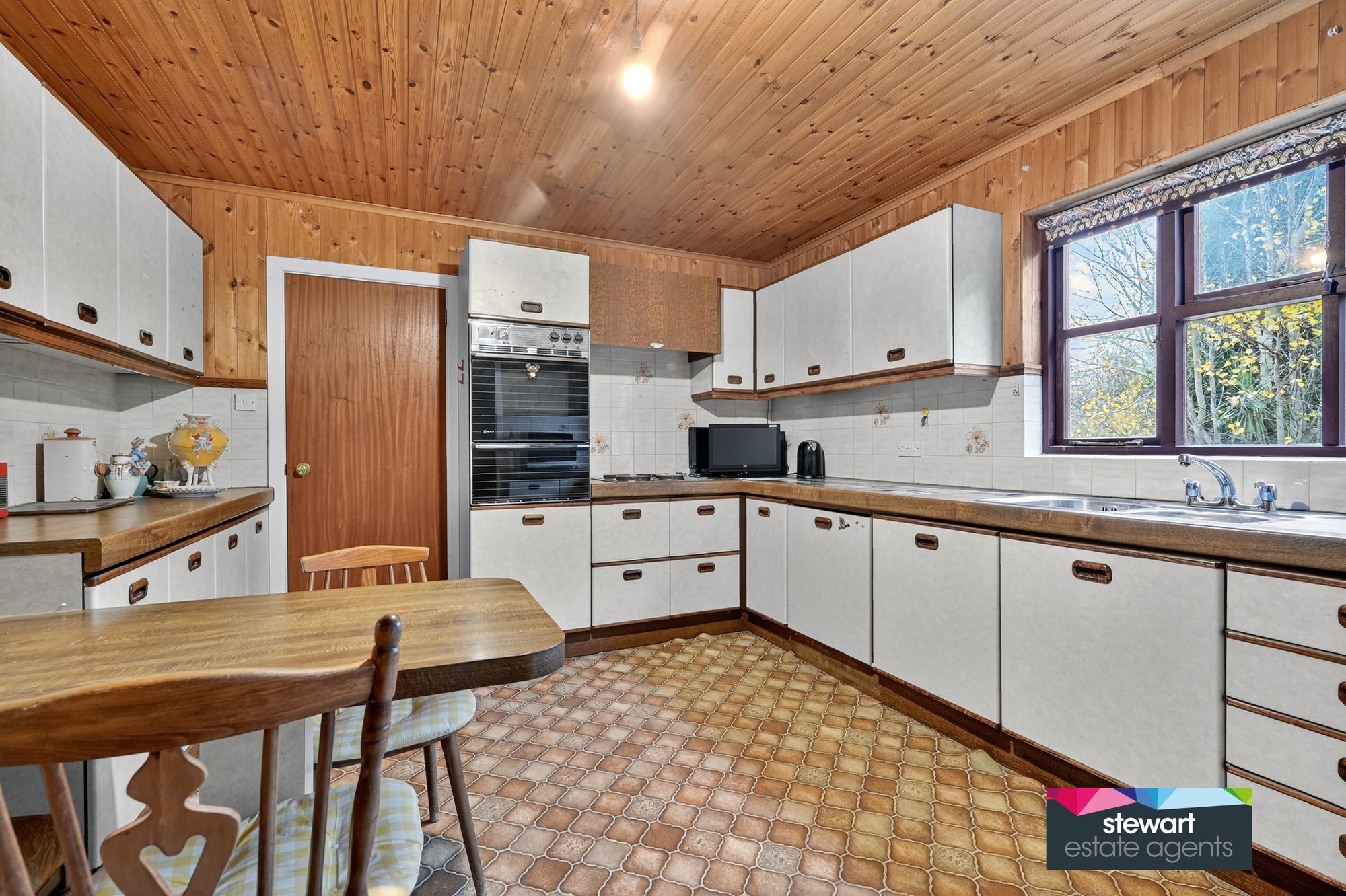 Kitchen with a good range of fitted high and low level units including a built in oven grill and inset hob with extractor fan above. Built in dining table. Timber panelled ceiling