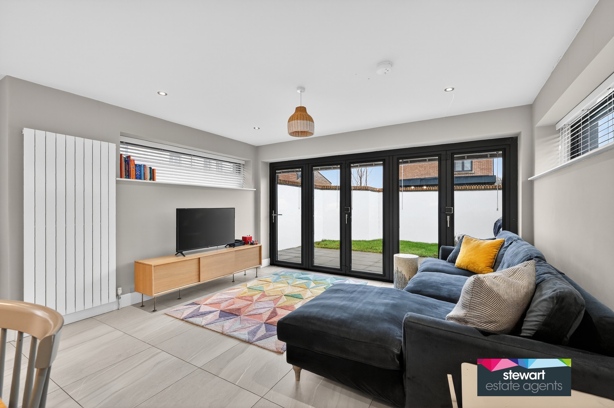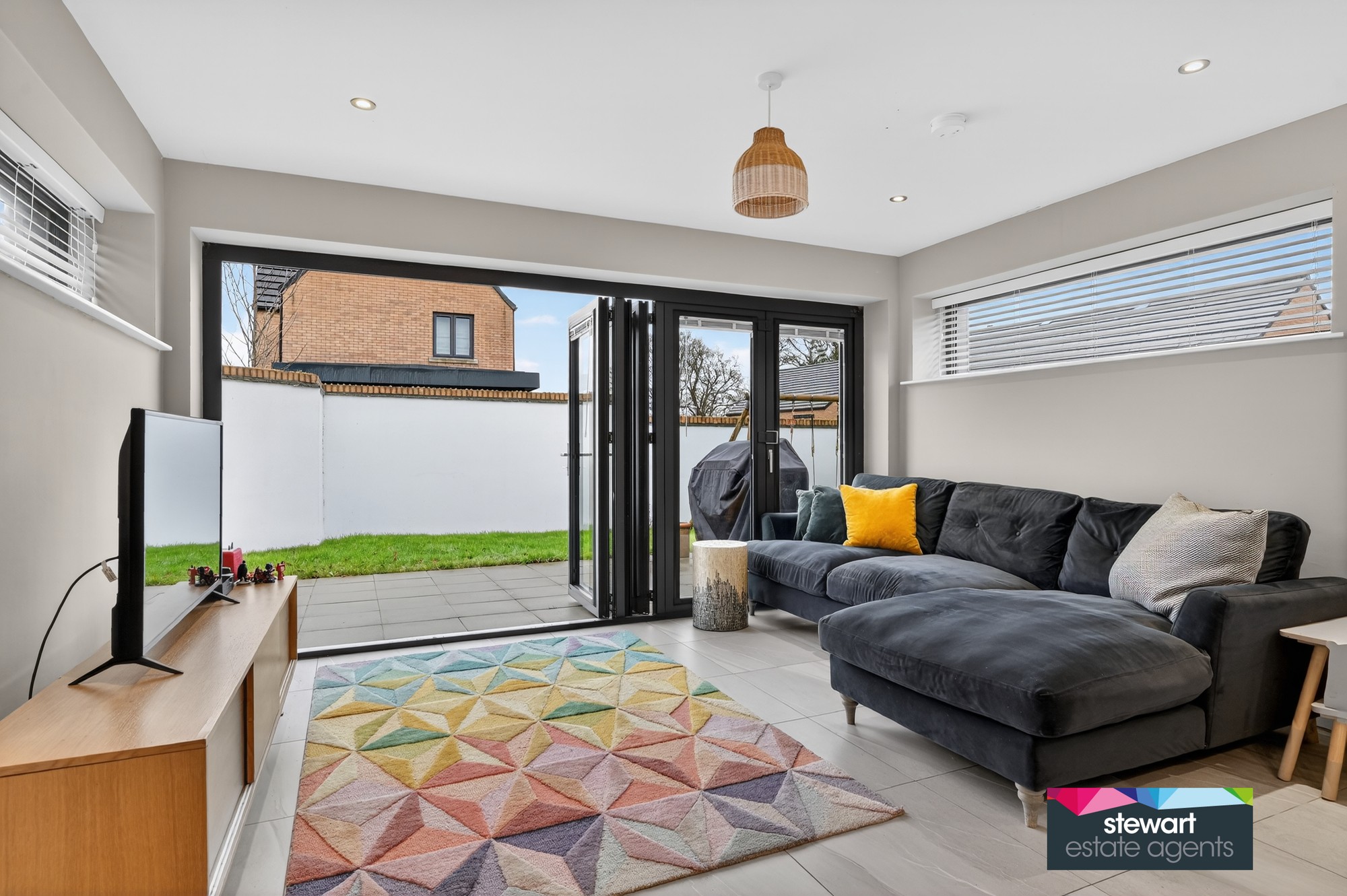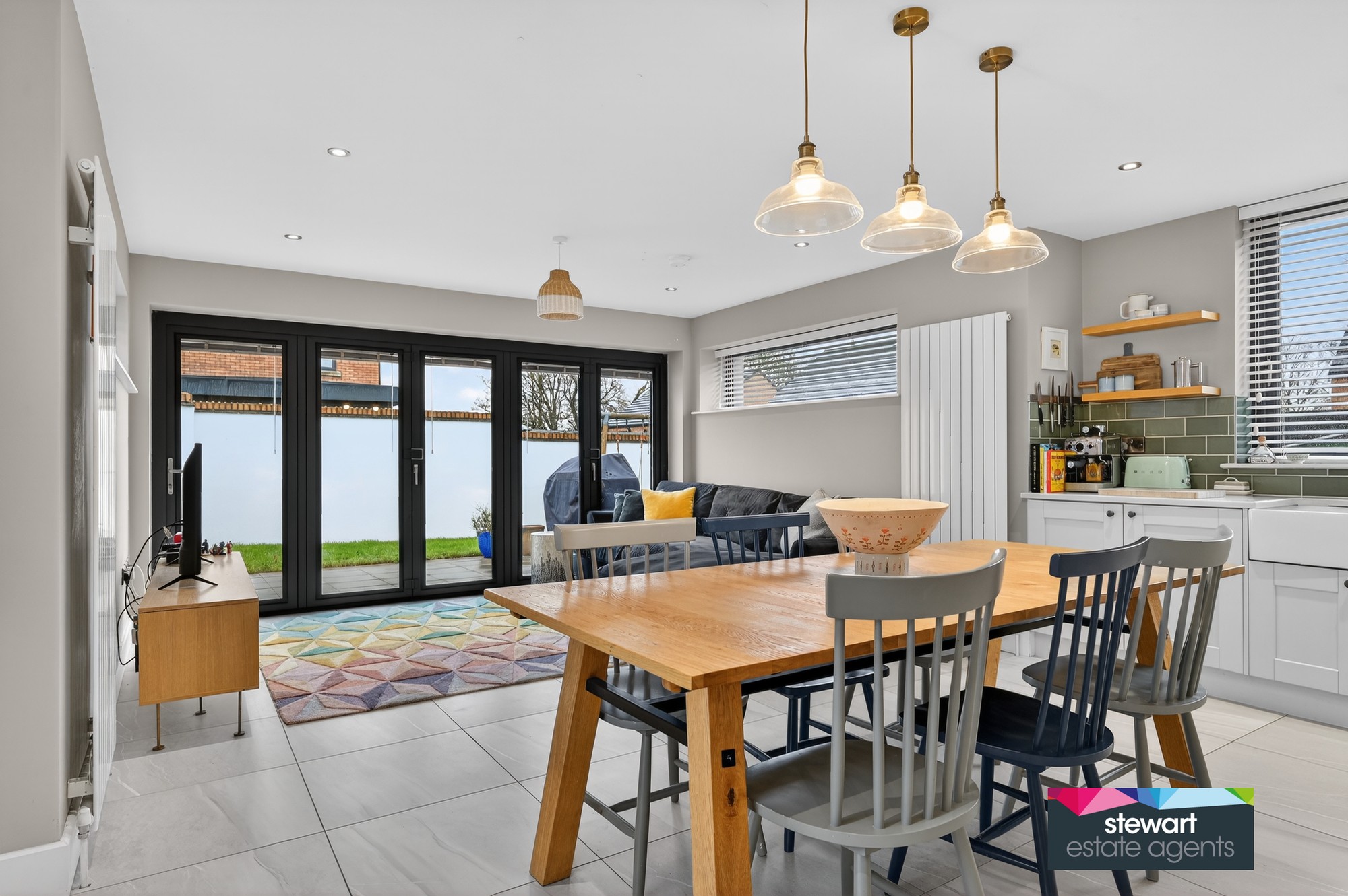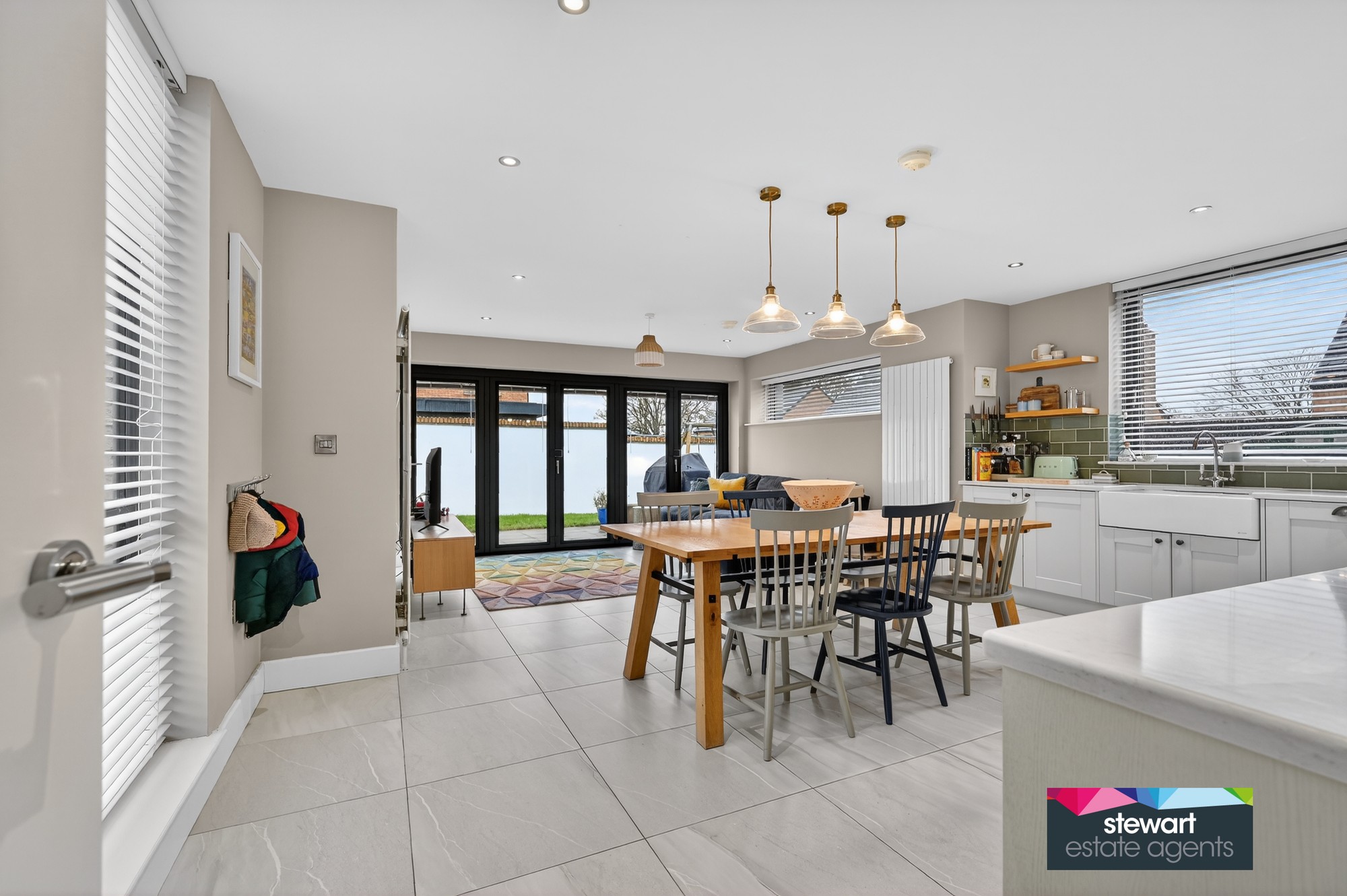 Stunning open plan kitchen with dining and family area with a contemporary style Bi fold patio doors to the garden and a feature high level window