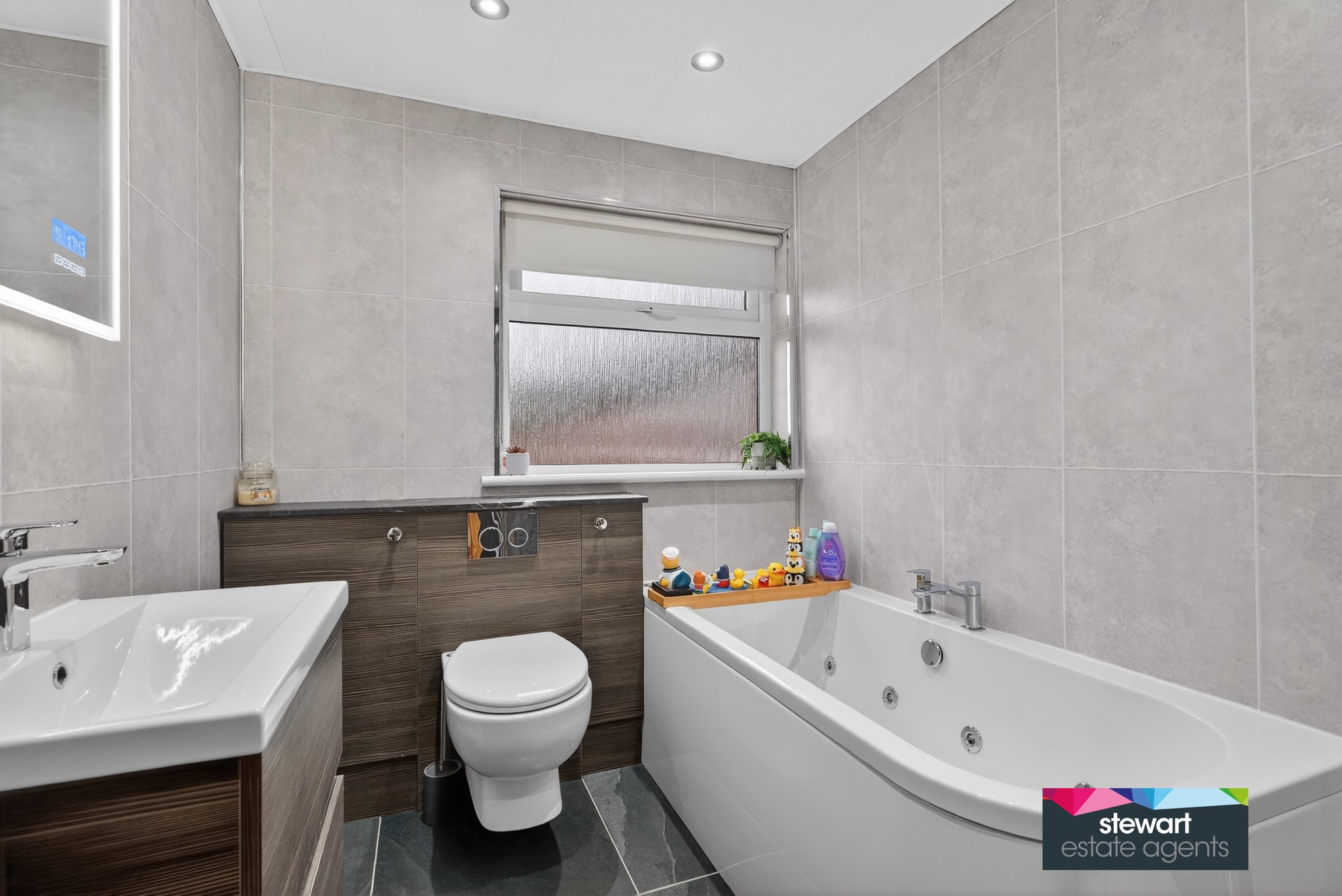 Bathroom with a beautifully designed modern suite including a jacuzzi style bath, WC and vanity wash hand basin. Separate shower cubicle with shower fitment. Feature tiles and wall mounted towel heater
