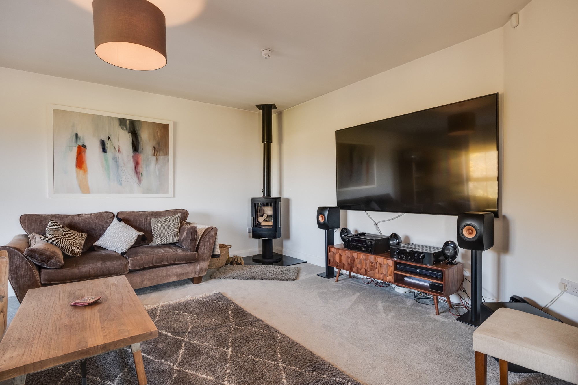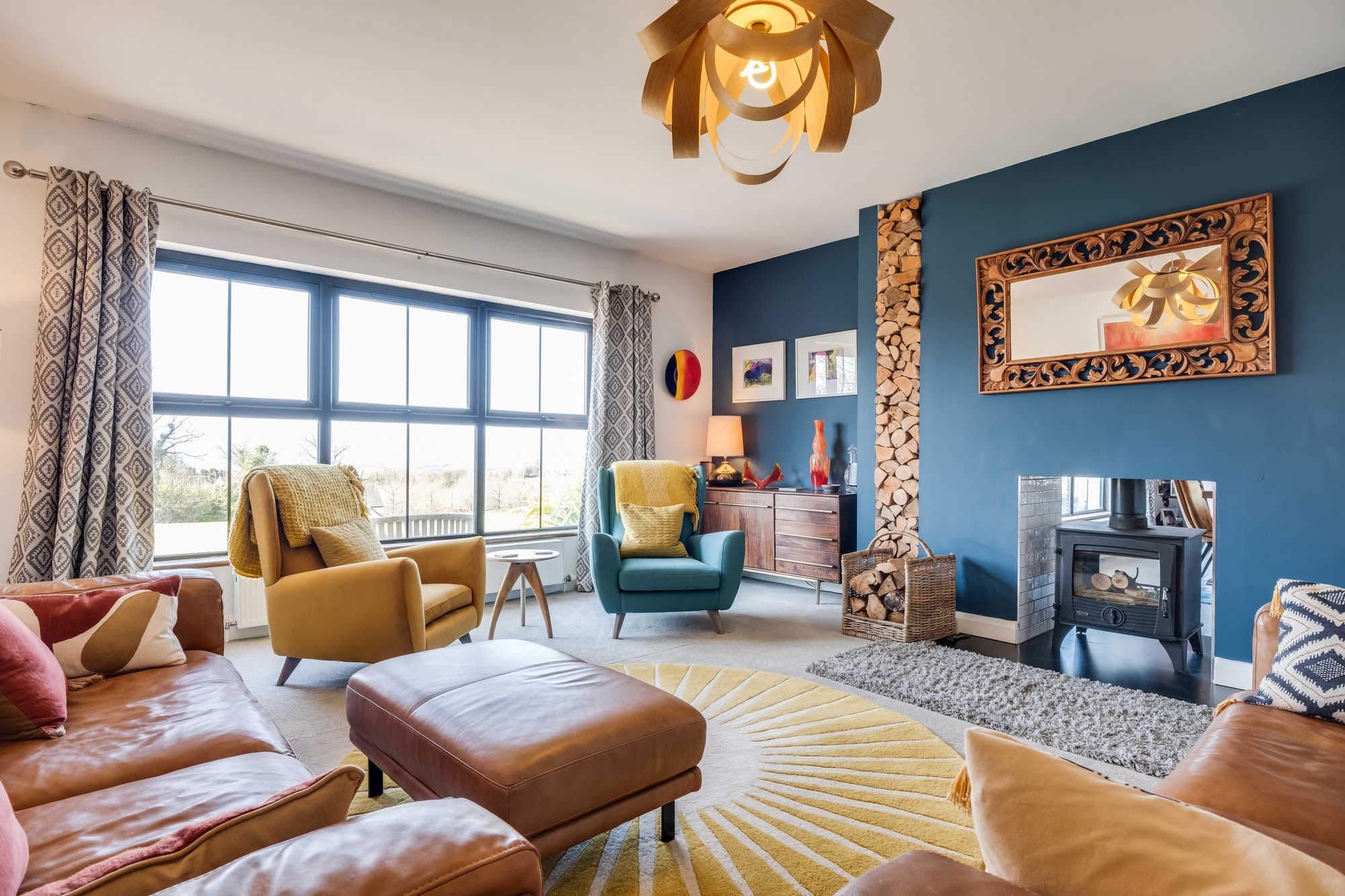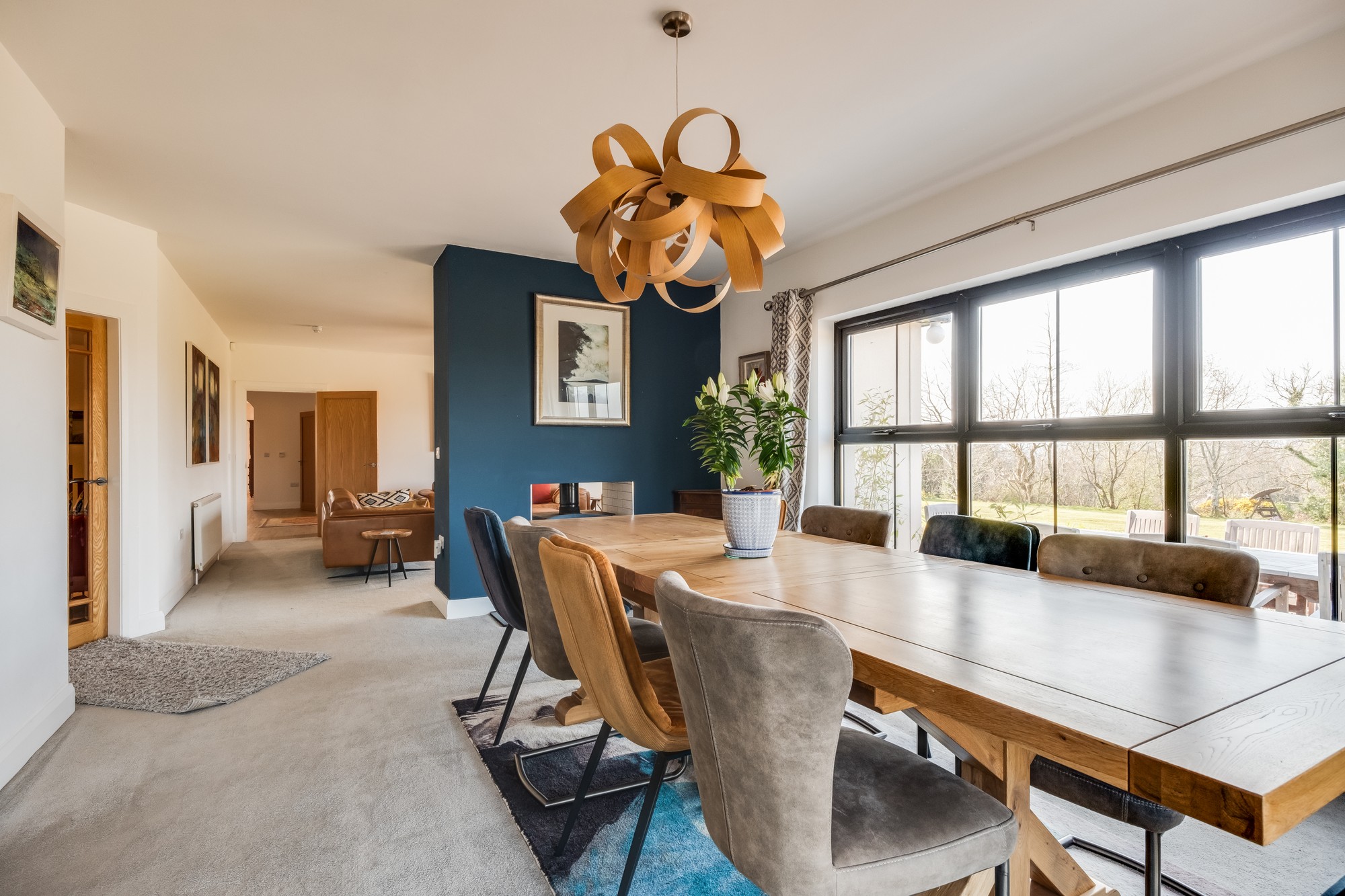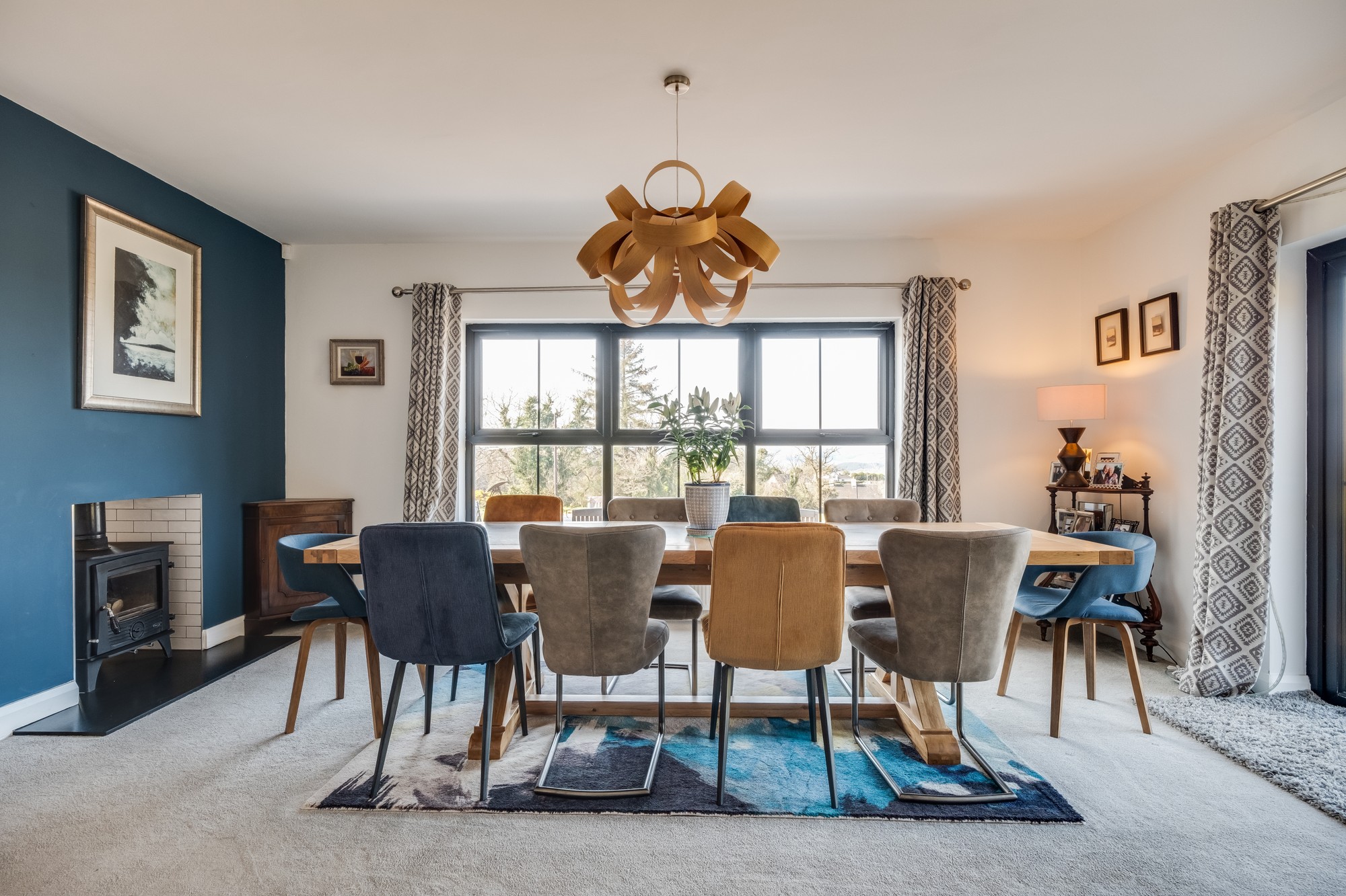Open Plan to Dining Room, double sided multi fuel stove, log alcove, views towards the mountains.