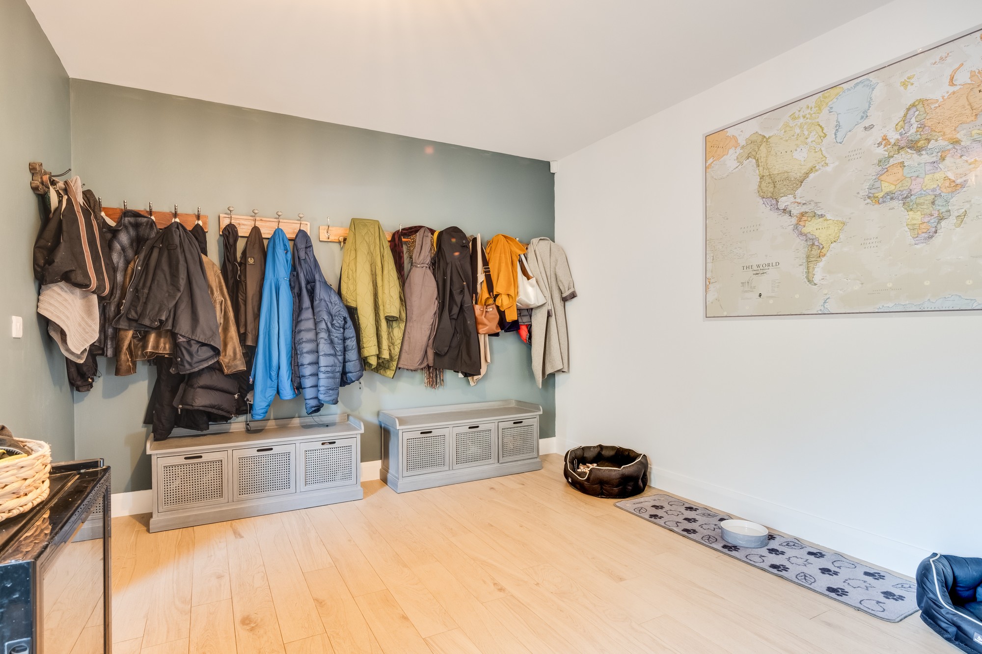 Woodgrain tiled floor, cloaks area, PVC exterior door with glazed inset.