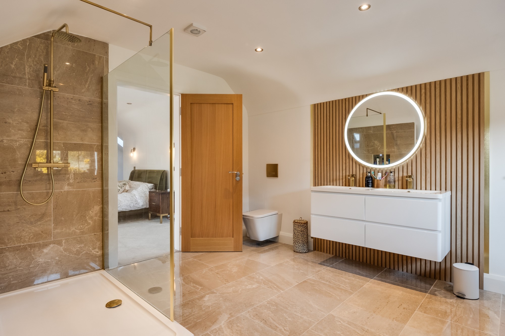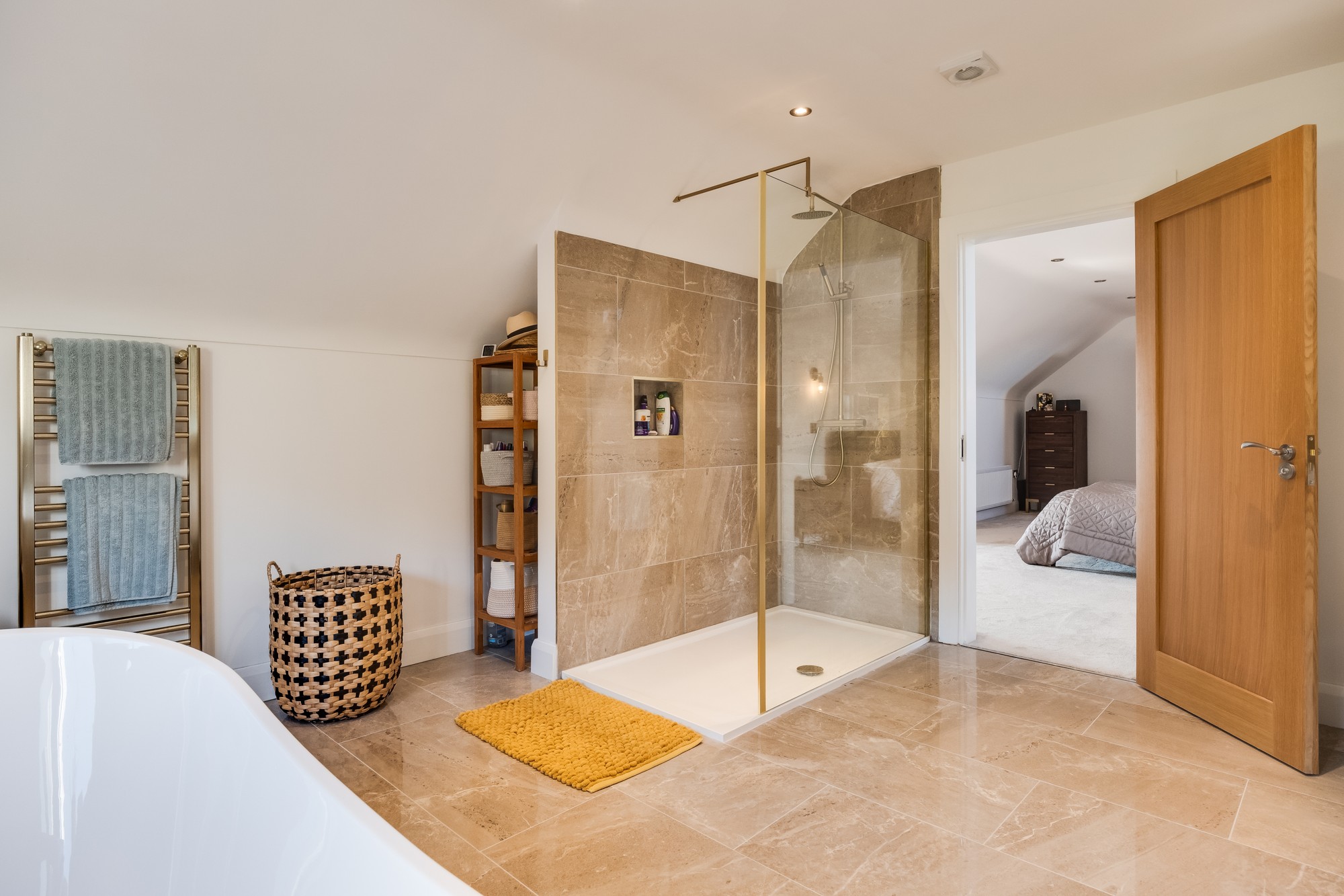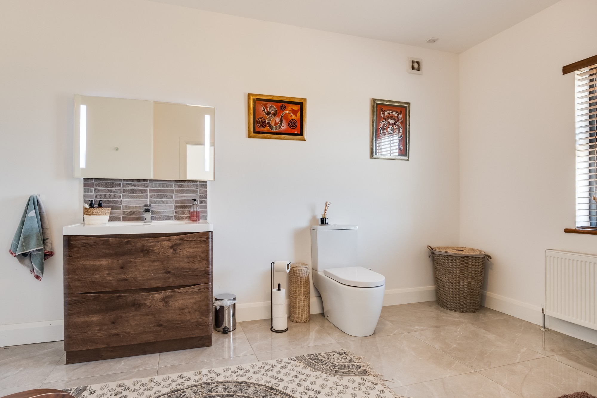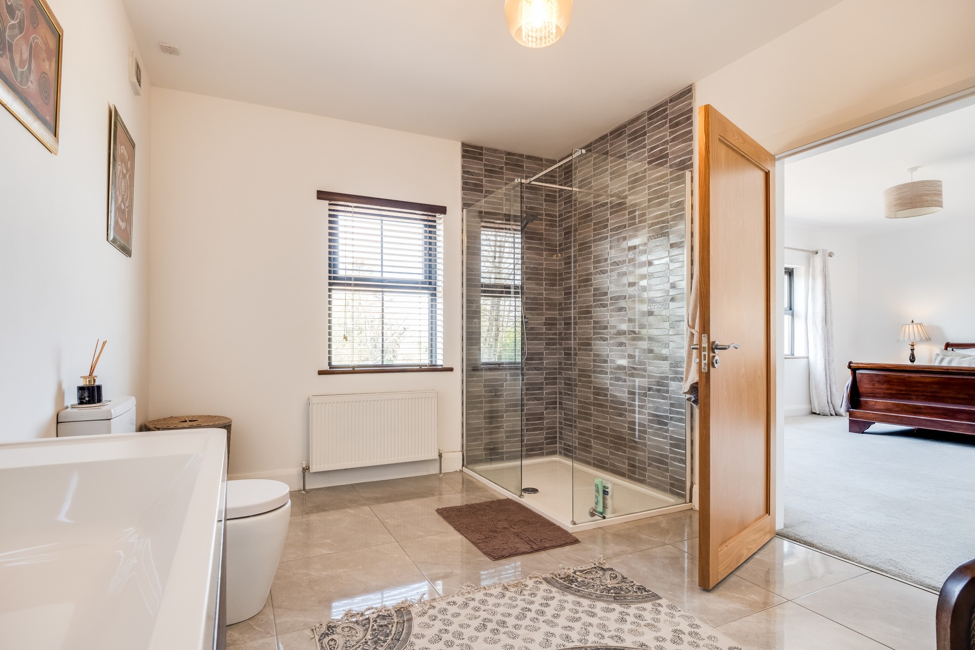 Luxury white suite incl. feature bath with free standing mixer taps vanity unit with double ceramic sink, wc with concealed push button controls, large step in shower cubicle with glazed sides and thermostatically controlled shower, alcove shelf, tiled floor & splashback, recessed lighting, feature wall panelling, heated towel rail.