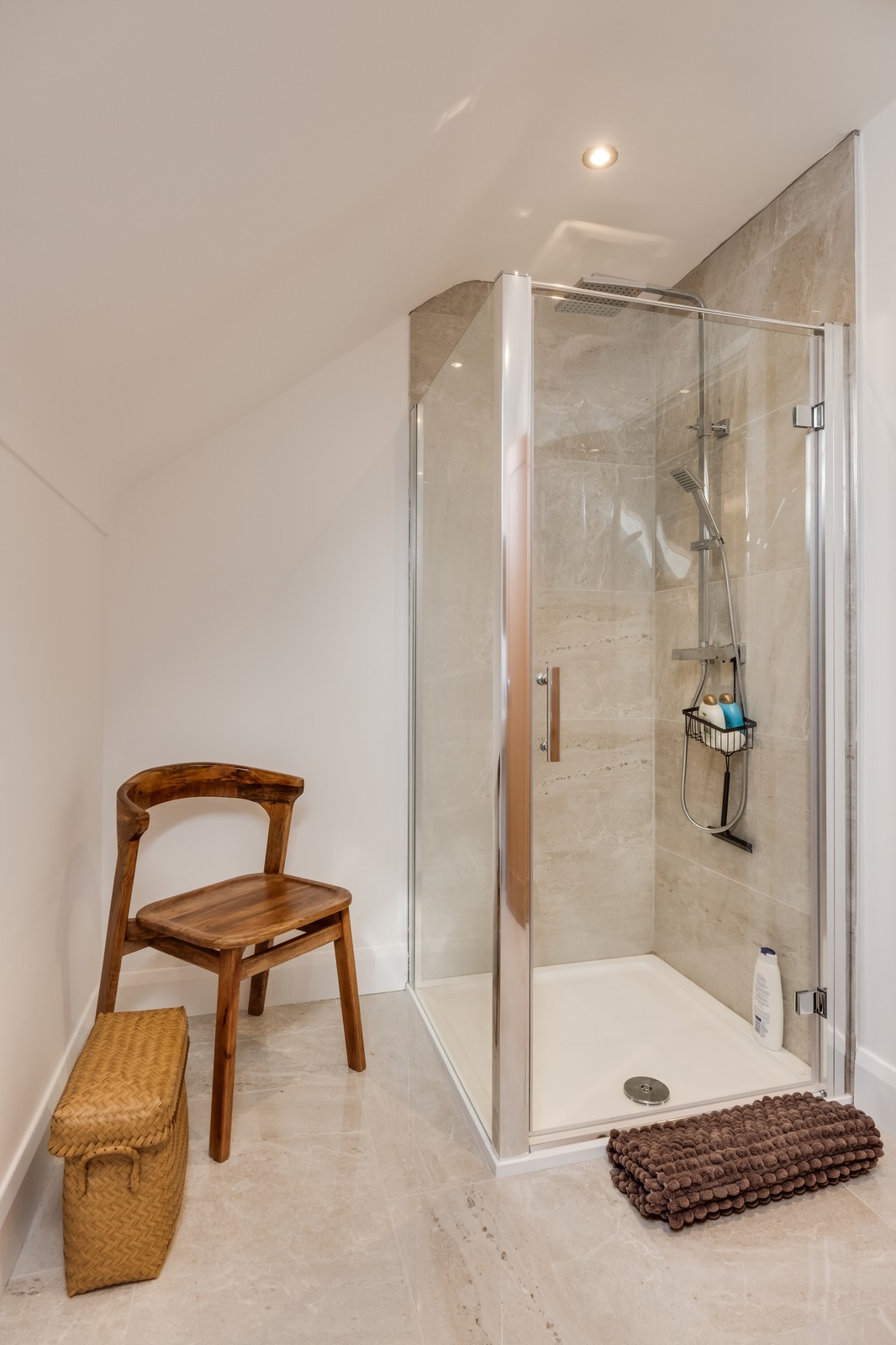 Luxury white suite, step in shower cubicle with glazed sides, thermostatically controlled shower, recessed lighting, heated towel rail, tiled floor & splashback.