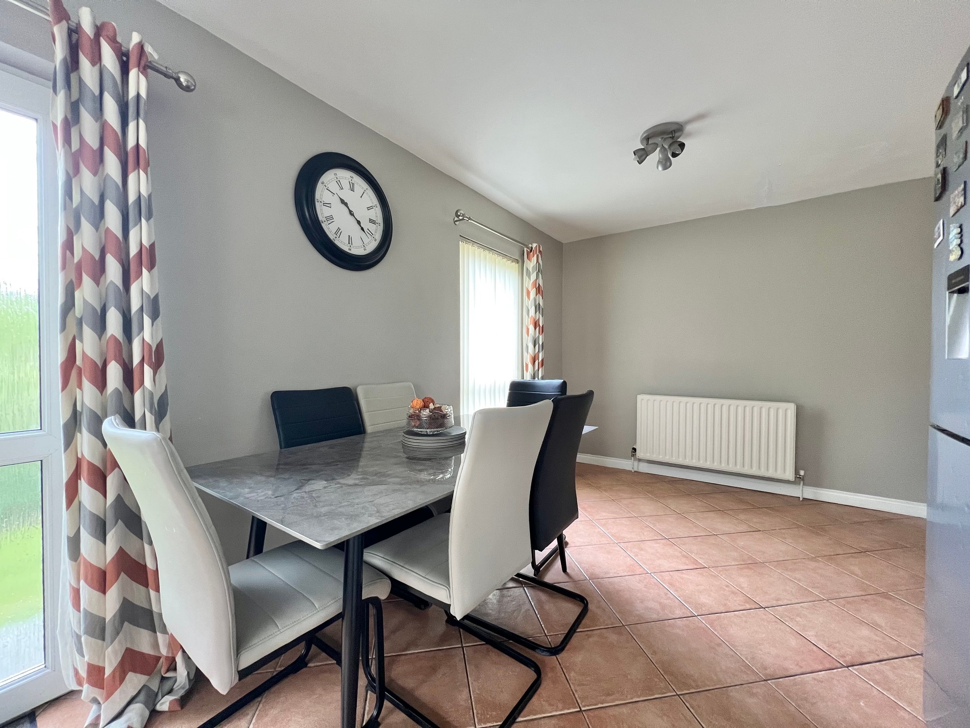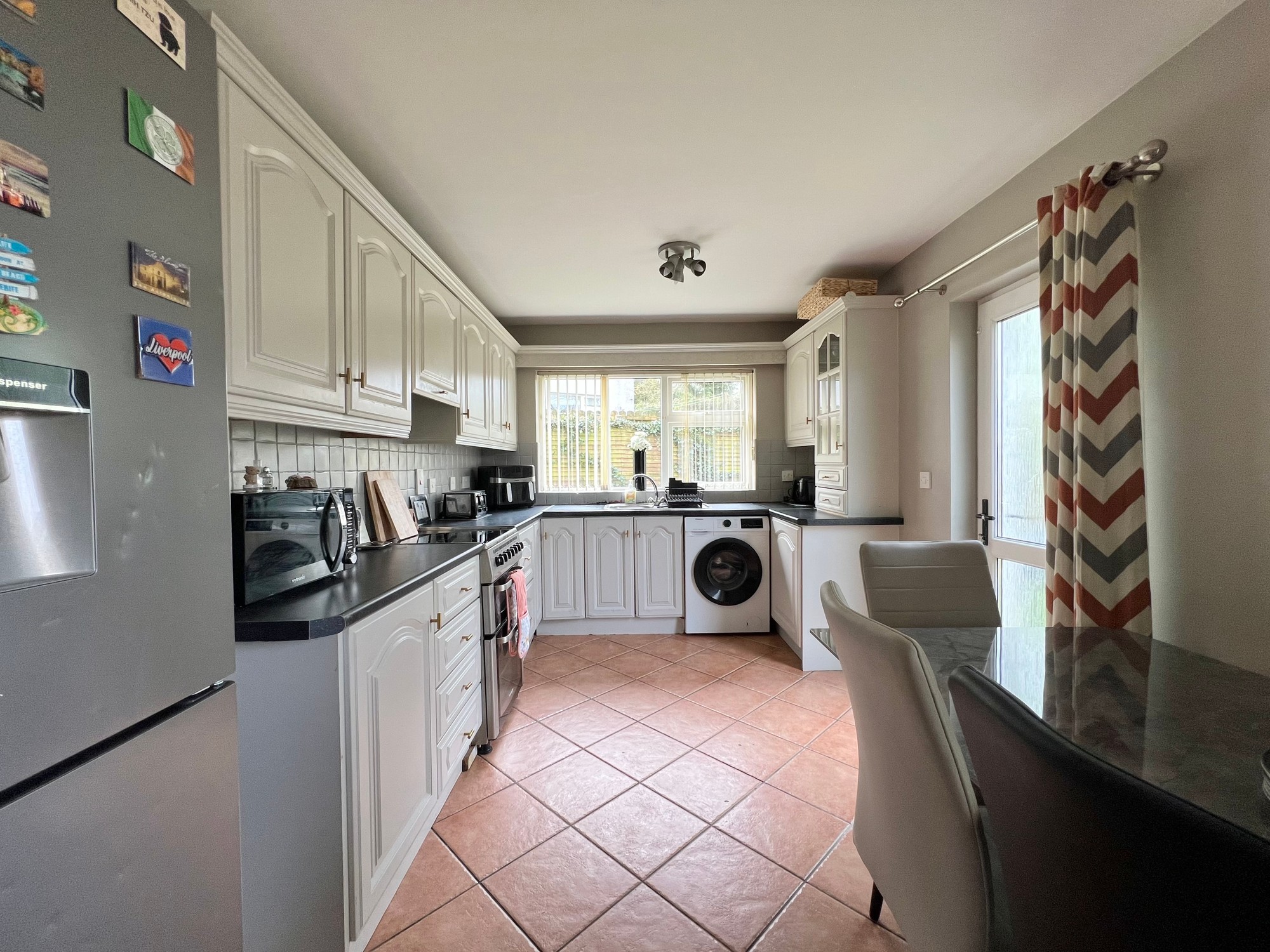 With eye & low level units, stainless steel sink and drainer unit, walls part tiled, extractor fan, plumbed for washing machine, dining area, floor fully tiled, door to rear garden