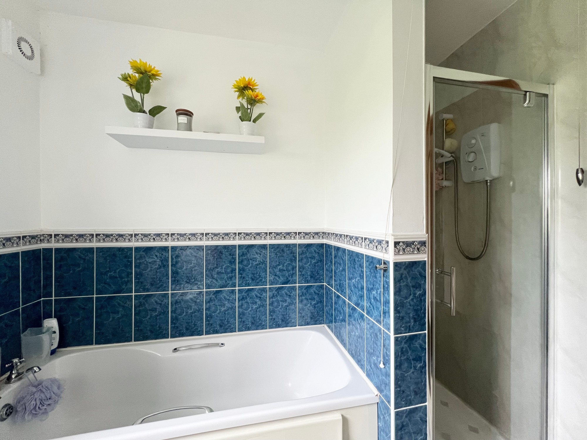 With wc, whb, bath & separate electric shower, walls part tiled.