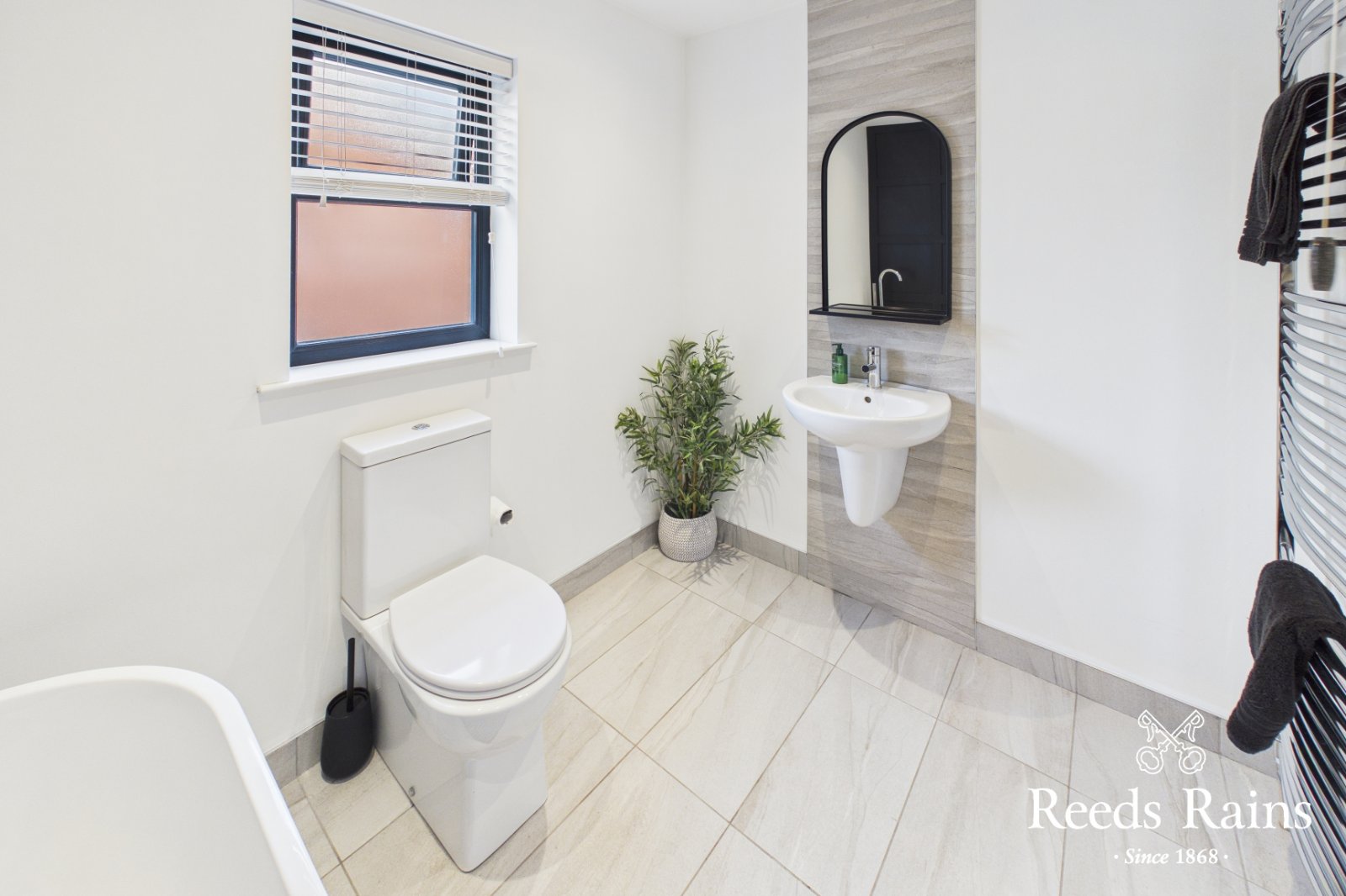 Ceramic tiled flooring, two piece suite comprising dual flush WC and half pedestal wash hand basin. Large chrome heated towel radiator.