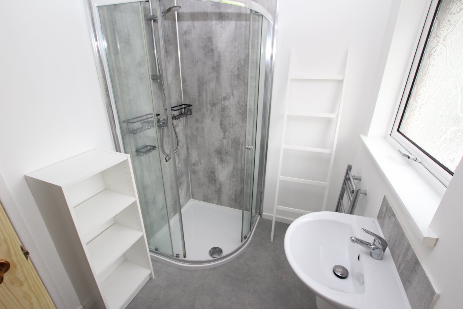 Modern three piece shower room complete with walk in shower with thermostatic shower. Low flush WC and wall mounted wash hand basin. Chrome heated towel rail.
