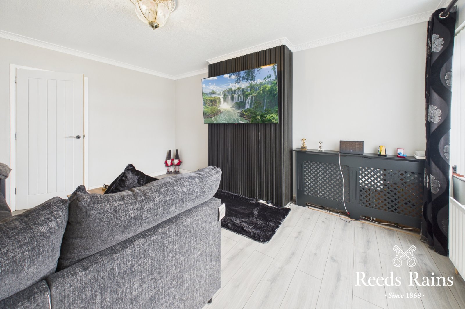 Spacious lounge with feature wall finished with bespoke acoustic panelling. Laminate flooring.