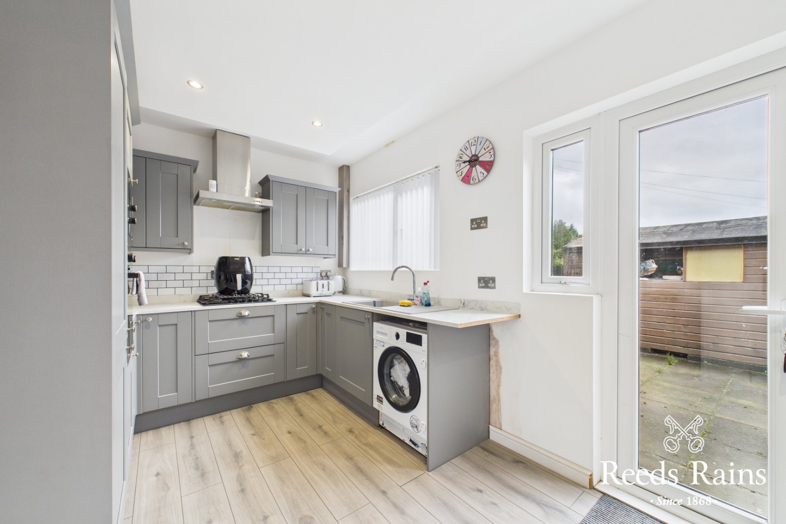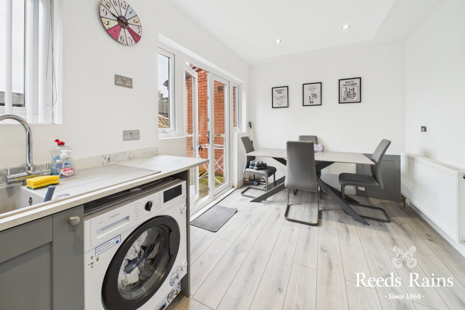 Range of high and low level units with matching worktop surfaces. Composite sink with chrome mixer tap. Built in oven and integrated fridge freezer. Four ring gas hob and stainless steel extractor fan overhead. Recessed spotlings and laminate flooring. Ample casual dining space with double doors to enclosed rear garden.
