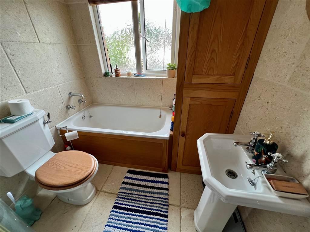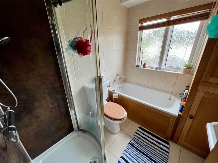Panel bath, walkin shower, low flush wc, wash hand basin. Tiled floor and walls.