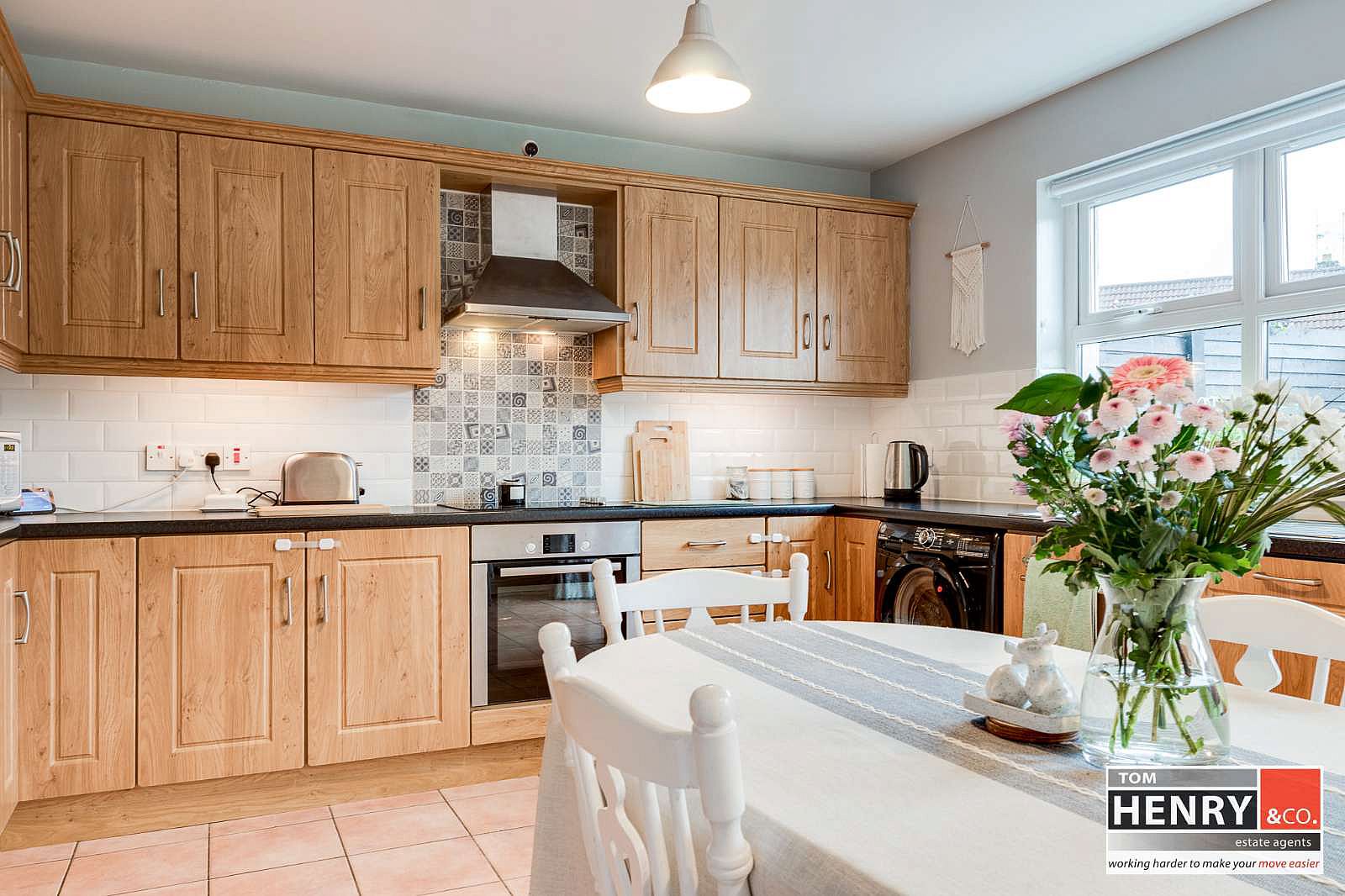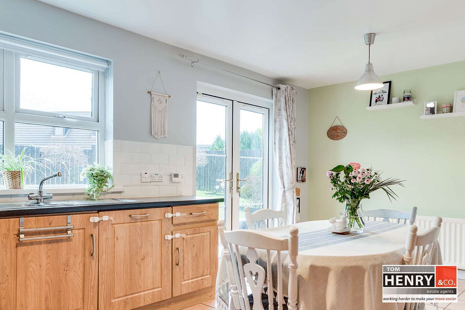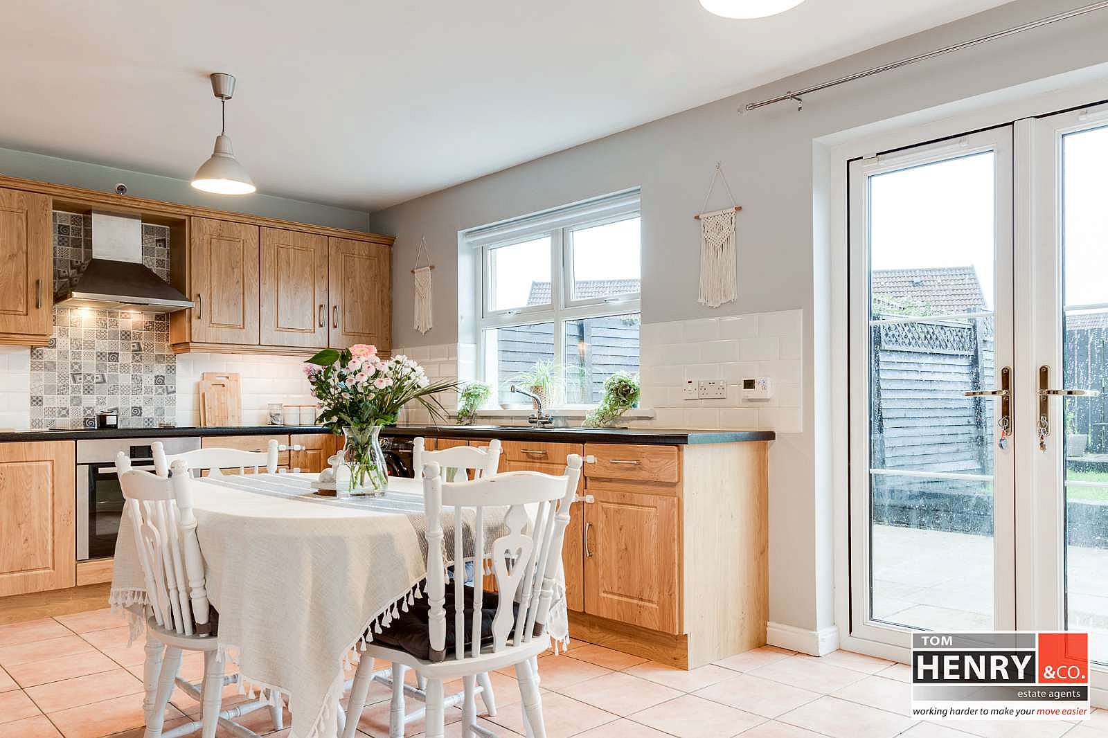 FITTED HIGH & LOW LEVEL UNITS WITH UNDER UNIT LIGHTING. ILLUMINATED GLAZED DISPLAY UNITS. S.S. 1 ½ SINK & DRAINER WITH MIXER TAP FITTING. INTEGRATED HOB & UNDER OVEN WITH X-FAN OVER IN S.S. CANOPY. INTEGRATED DISHWASHER. INTEGRATED “HOOVER” SMART FRIDGE FREEZER. PLUMBED FOR A.W.M. TILED BETWEEN UNITS. TILED FLOOR. GLAZED FRENCH DOORS FROM DINING AREA TO REAR GARDEN.