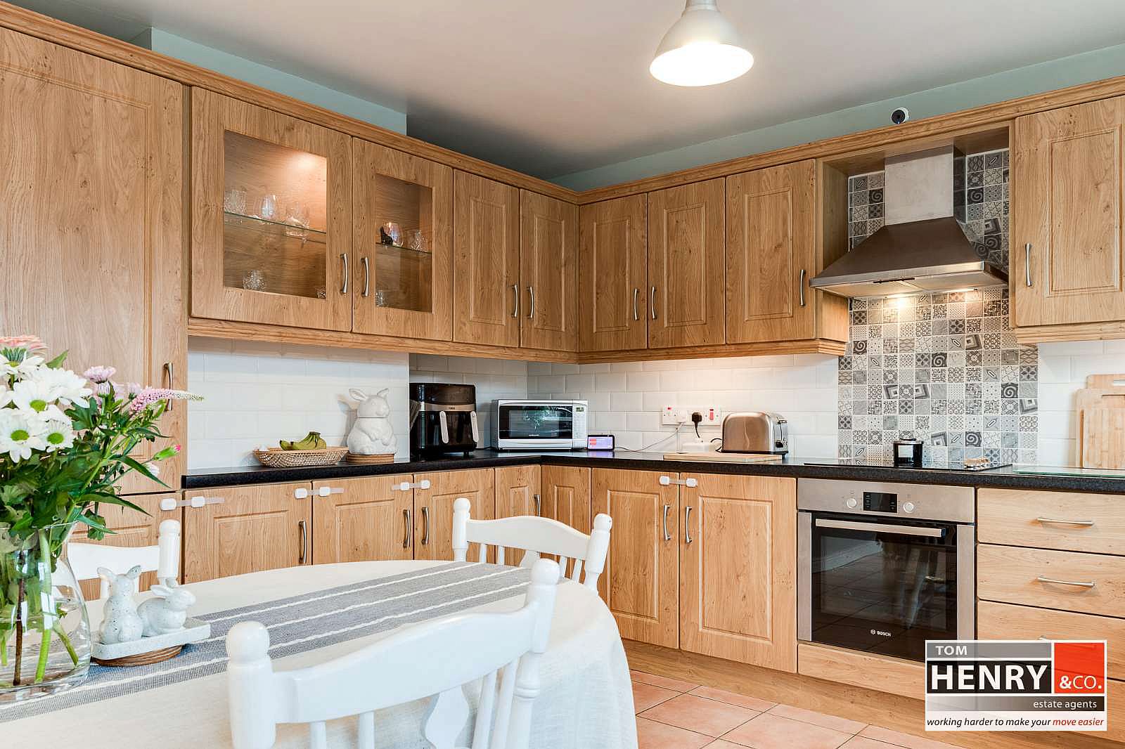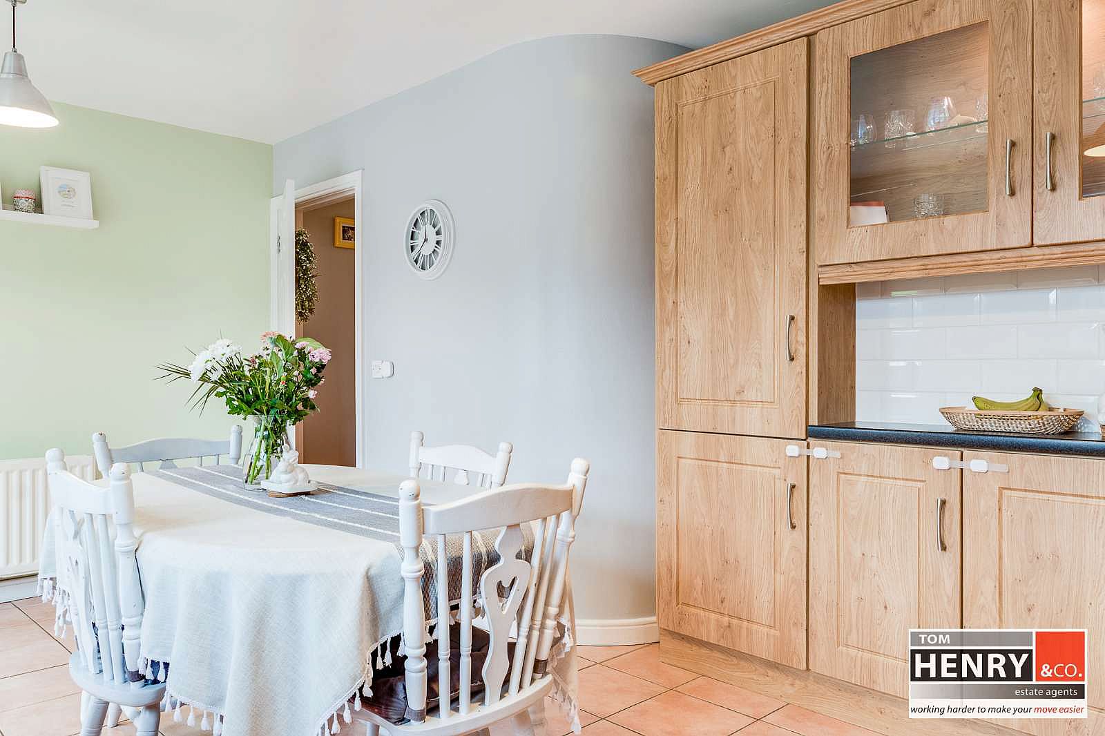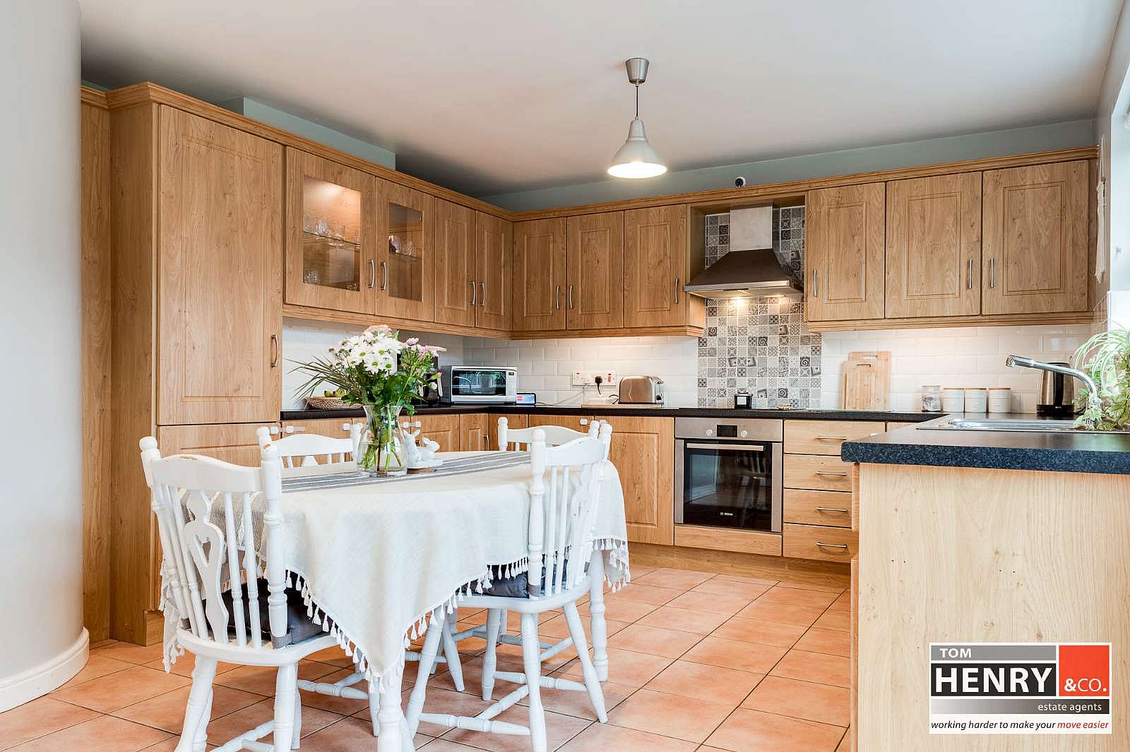 FITTED HIGH & LOW LEVEL UNITS WITH UNDER UNIT LIGHTING. ILLUMINATED GLAZED DISPLAY UNITS. S.S. 1 ½ SINK & DRAINER WITH MIXER TAP FITTING. INTEGRATED HOB & UNDER OVEN WITH X-FAN OVER IN S.S. CANOPY. INTEGRATED DISHWASHER. INTEGRATED “HOOVER” SMART FRIDGE FREEZER. PLUMBED FOR A.W.M. TILED BETWEEN UNITS. TILED FLOOR. GLAZED FRENCH DOORS FROM DINING AREA TO REAR GARDEN.