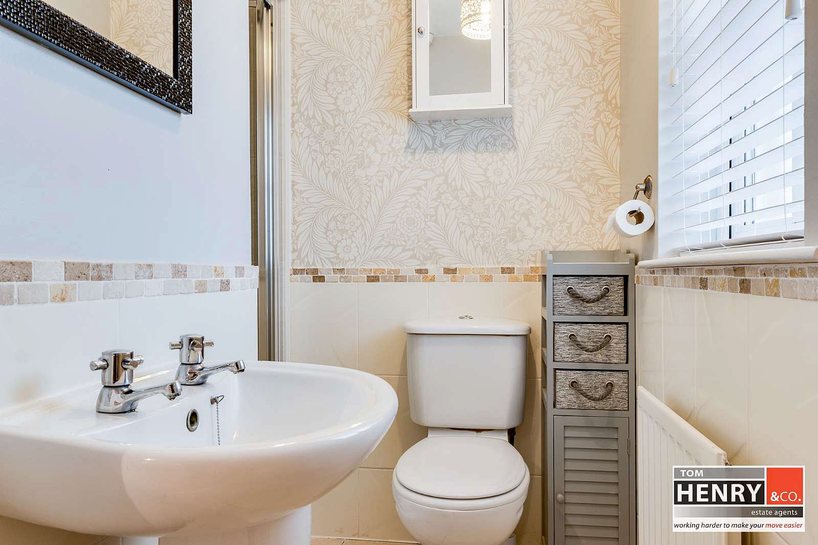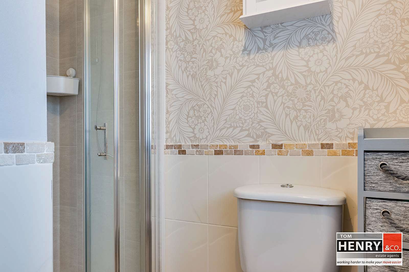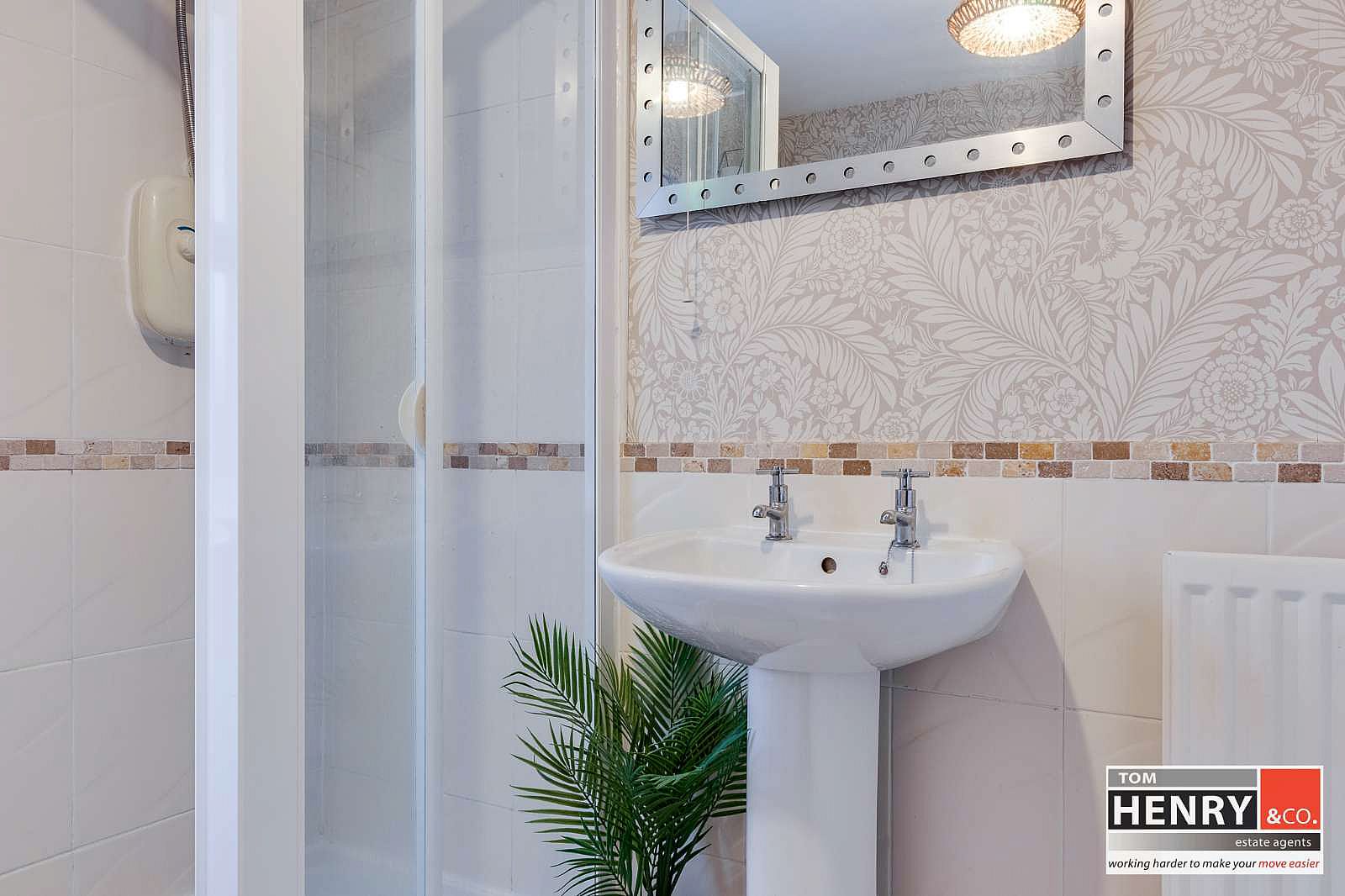 BATH. FULLY TILED ELECTRIC SHOWER. WASH HAND BASIN. TOILET. ½ TILED WALLS. TILED FLOOR. X-FAN.