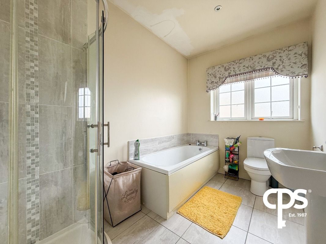 Four-piece suite including W/C, hand wash basin, corner power shower, and bath with fully tiled splashback. Tiled flooring and overhead spot lighting complete this modern family bathroom.