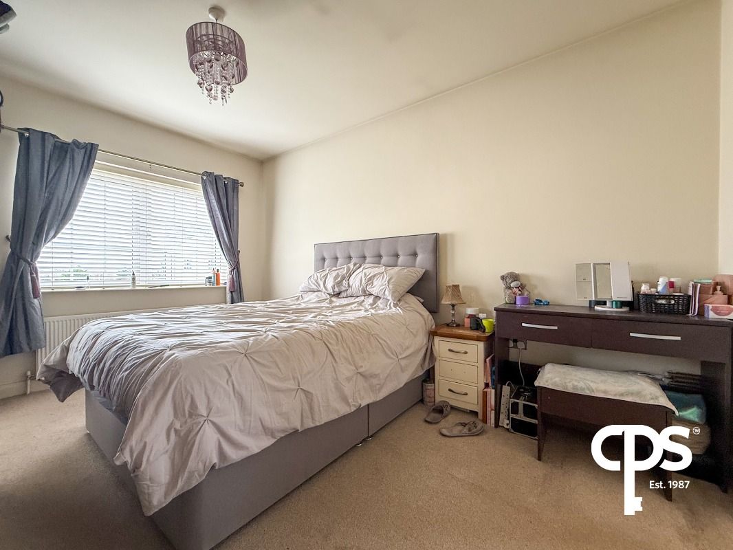 A generous double bedroom with carpeted flooring, radiators, and electrical sockets. The master benefits from ample space for a king-size bed, wardrobes, and additional furniture. En-suite bathroom included.