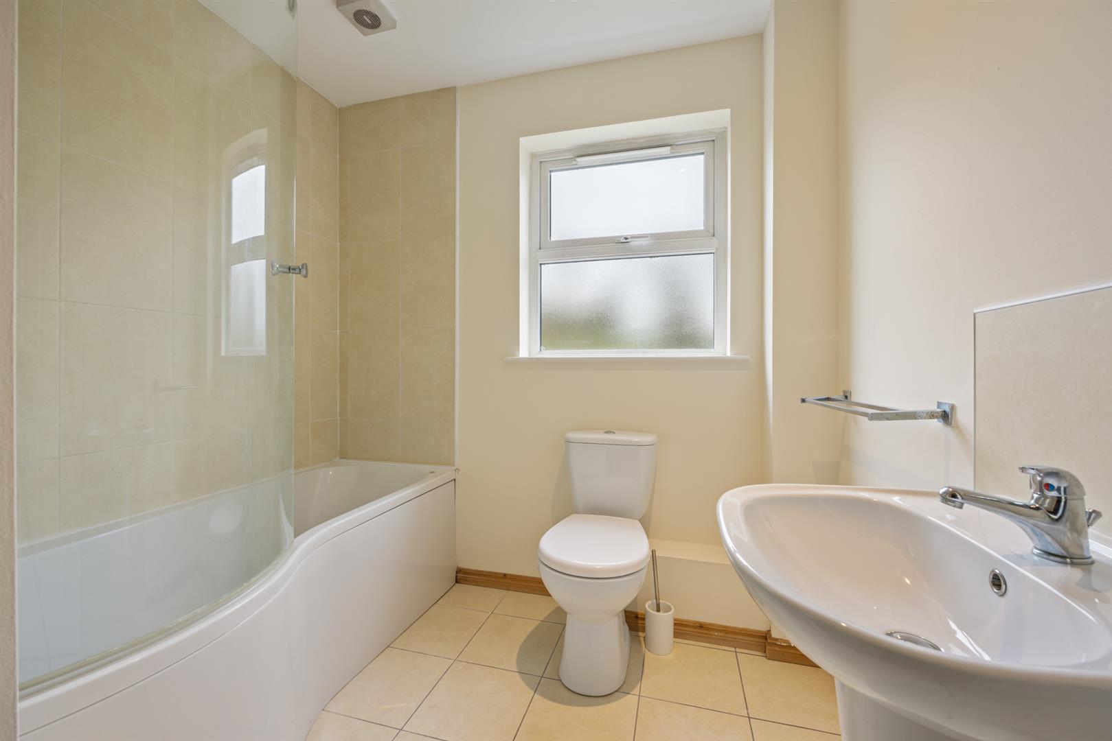 Contemporary, white three piece suite comprising panelled bath, semi pedestal wash hand basin and WC. Thermostat controlled main shower unit and curved glass shower screen over bath. Part tiling to walls. Tiled floor.