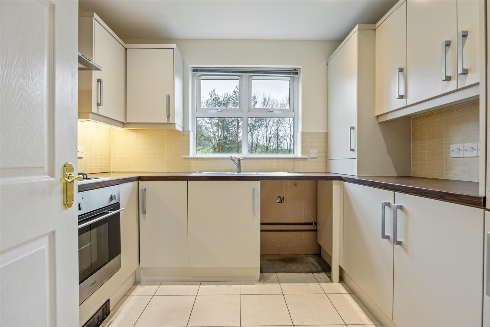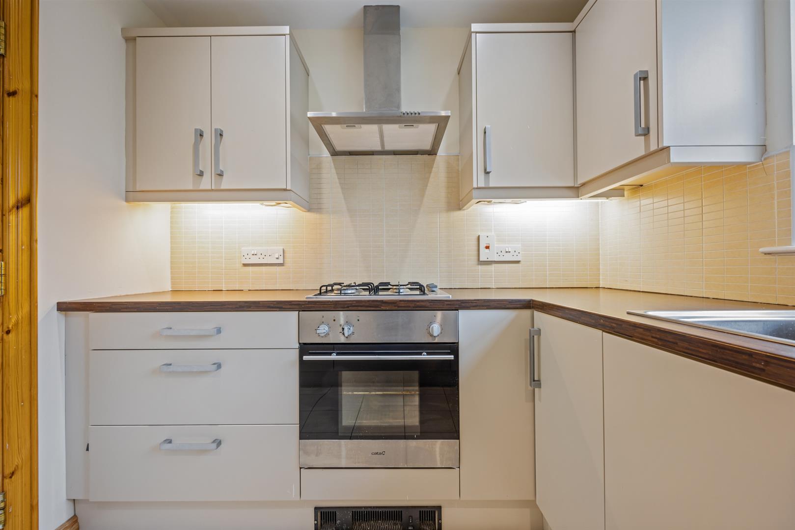 Modern, fitted kitchen with range of high and low level storage units with contrasting wood block effect melamine work surface. 1.5 bowl sink unit with draining bay. Rural view. Integrated gas hob with extractor hood over. Integrated oven and fridge freezer. Plumbed and space for washing machine. Gas fired central heating boiler (housed within matching unit). Splashback tiling to walls. Tiled floor.