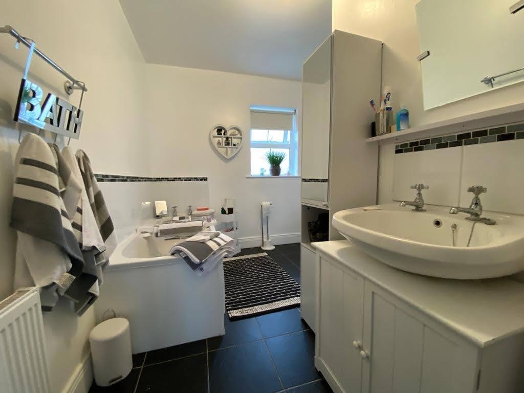 Comprising bath, walk in shower, whb and wc, tiled floor.