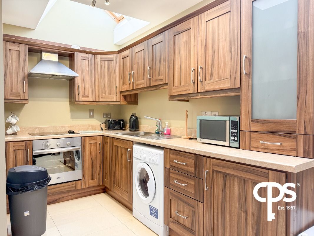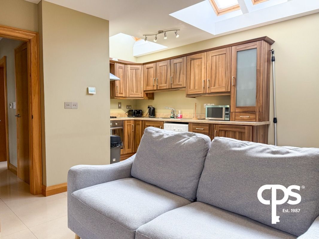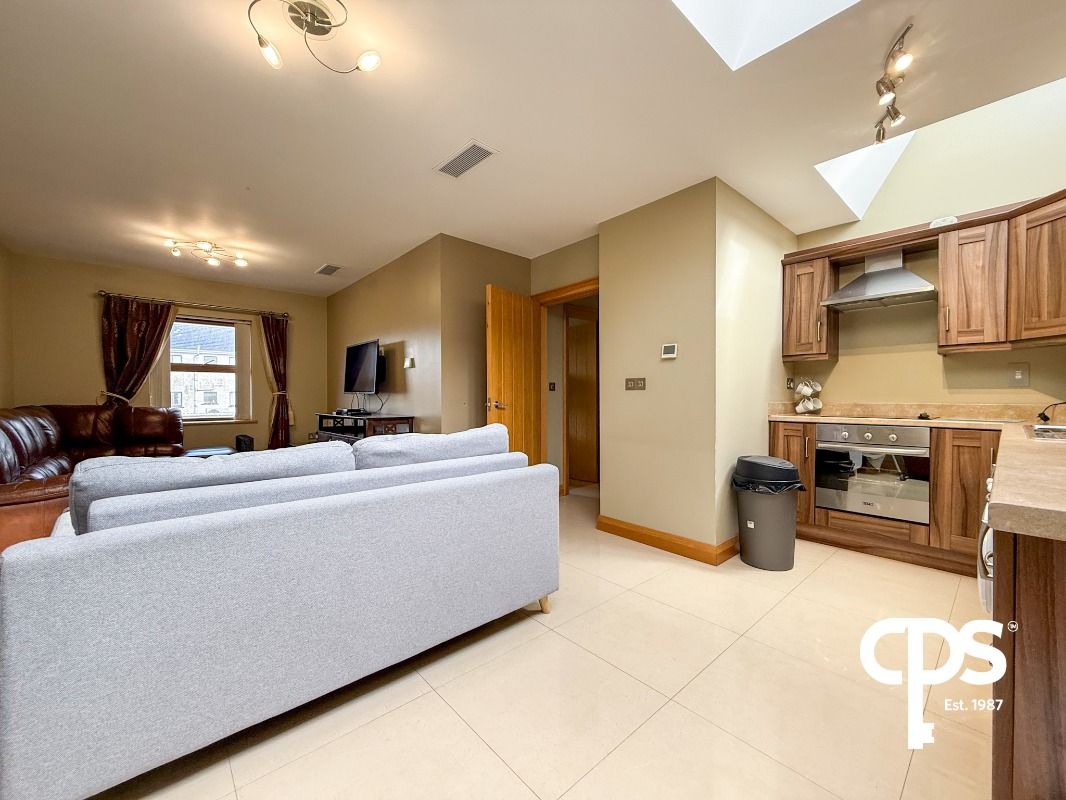 Spacious open plan kitchen and living area, well laid out to maximise both living and dining space. The kitchen is fitted with a range of high and low level units and includes an integrated oven, electric hob with overhead extractor fan, and stainless steel sink. Plumbing is in place for a washing machine/tumble dryer. Finished with tiled flooring throughout, this is a bright and practical space ideal for everyday living and entertaining.