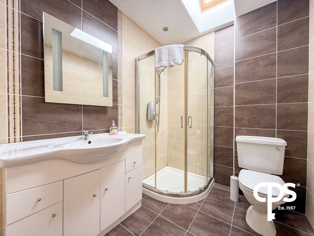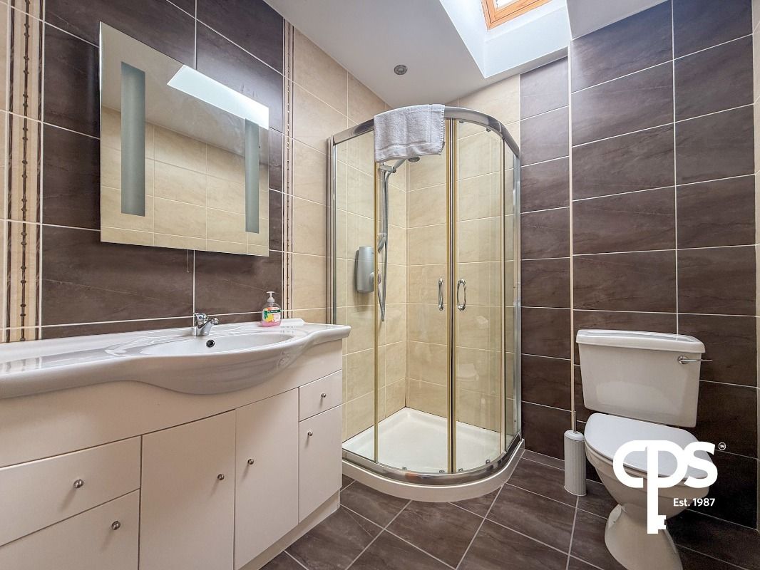 Fully tiled bathroom comprising a three-piece suite including wash hand basin, WC, and corner power shower. Finished with tiled floors and walls and complemented by a heated towel radiator.